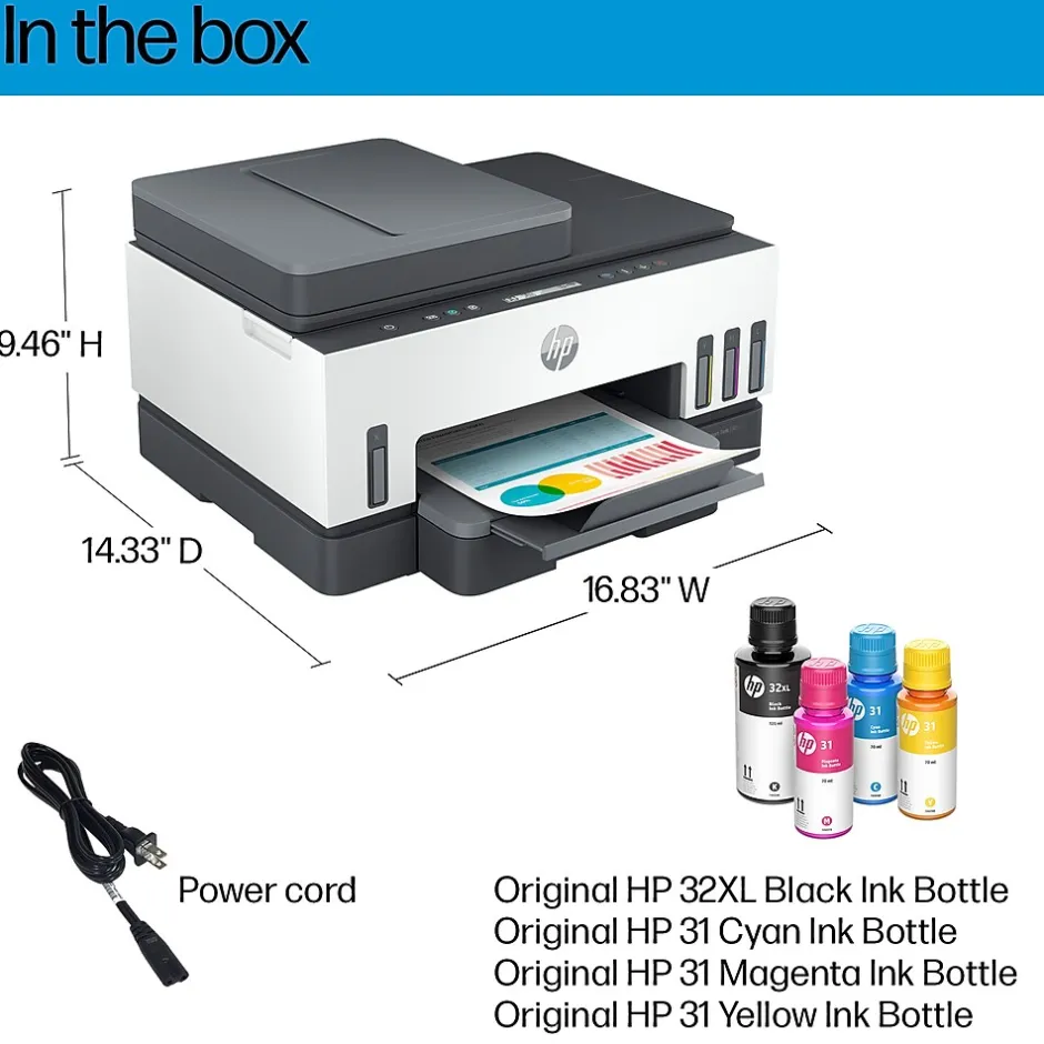 - WHAT’S IN THE BOX – 28B70A HP Smart Tank 7301 All-in-One Printer, Original HP 32XL Black Ink Bottle, Original HP 31 Cyan Ink Bottle, Original HP 31 Magenta Ink Bottle, Original HP 31 Yellow Ink Bottle, Ink caution flyer, Setup guide, Reference guide, Regulatory flyer, Power cord.