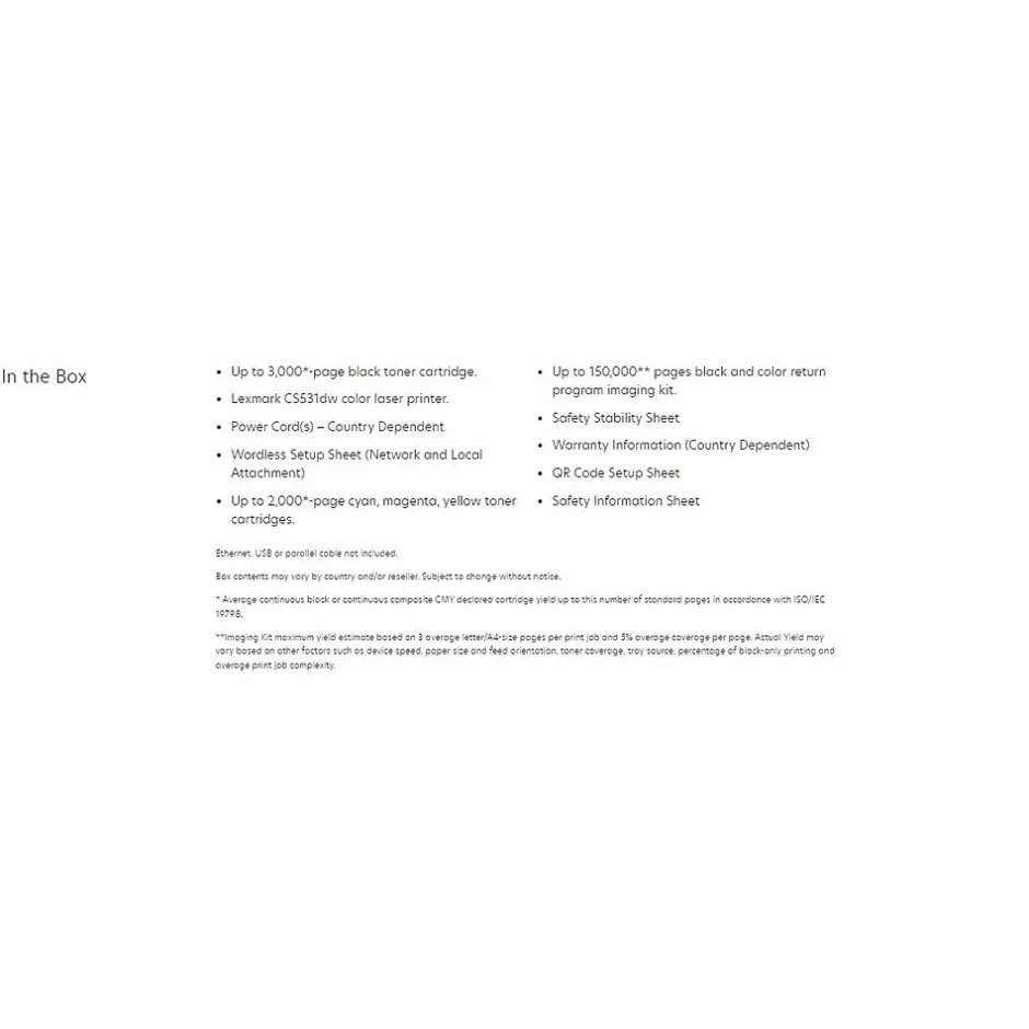 - In the Box: Lexmark CS531dw Color Laser Printer, Power CordBlack Toner Cartridge (3000 Pages), Cyan Toner Cartridge (2000 Pages),,Magenta Toner Cartridge (2000 Pages),,Yellow Toner Cartridge (2000 Pages),,Black and Color Return Program Imaging Kit (150,000 Pages)