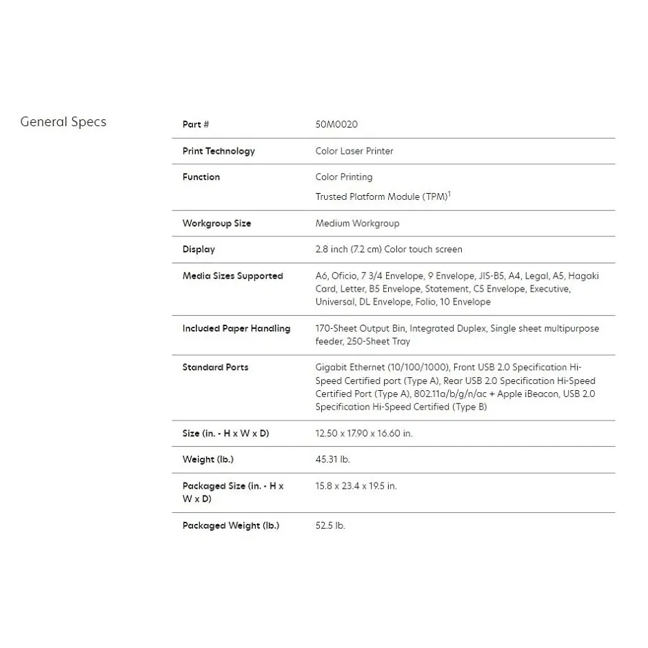 | Network Ready Specifies if the printer’s output is either black and white (also referred to as monochrome), or color. | Color |