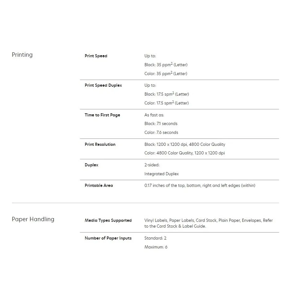 Maximum Print Speed (Black): 35 ppm; Maximum Print Speed (Color): 35 ppm; Print Resolution (Black) (Width x Height): 1200 dpi x 1200 dpi; Print Resolution (Color) (Width x Height): 1200 dpi x 1200 dpi.