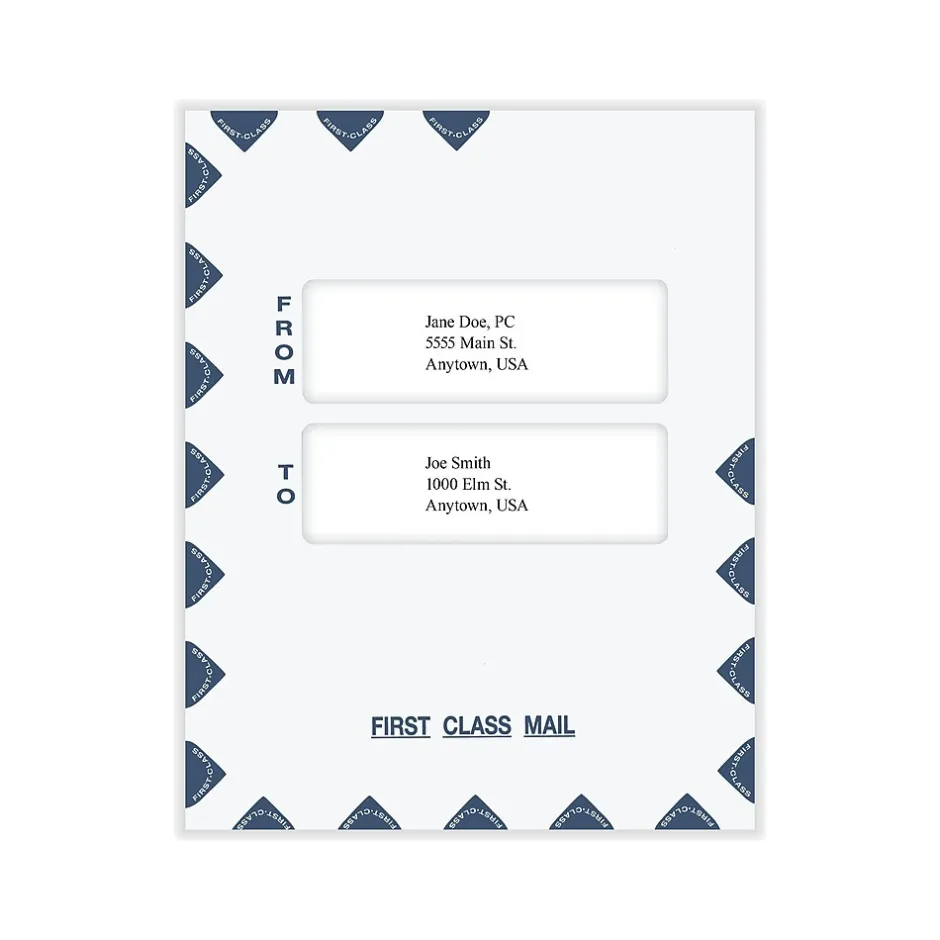 The ComplyRight First Class income tax return window envelope serves as a multipurpose tax return envelope that will dress up every tax return and report from your office. Easily mail large documents and tax returns with an address cover sheet, a perfect solution to quickly seal and protect data. The way you present your work needs to match your firm’s professionalism every step of the way. Both the recipient address and return address show through the envelope windows.