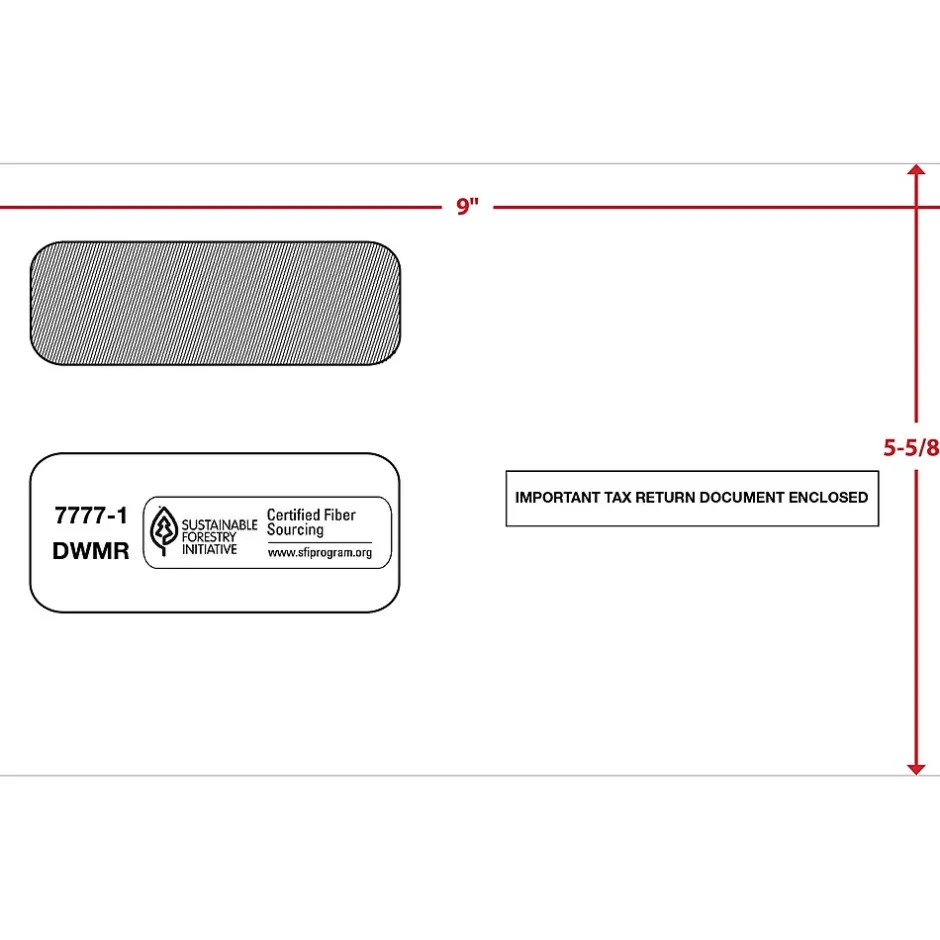 This double-window envelope accommodates the ACA 1095-C tax forms. The windows display both payer and recipient name and address. Features a moisture seal flap.