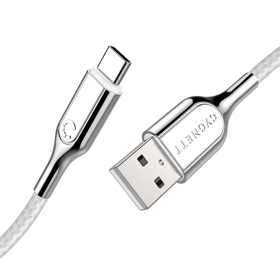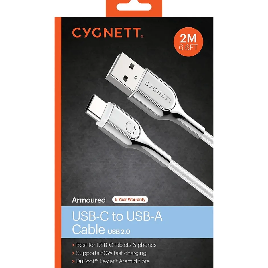 Fear running out of battery life? The 6 ft. Cygnett Armored 2.0 USB-C to USB-A Cable supports 3 amp/60 watt fast charging, ensuring your USB-C smartphone or tablet will be powered-up in no time. It allows you to experience up 480 Mbps transfer speeds so you can quickly sync your photos, music, and data to your existing USB-C enabled device. Elongated cable connectors forged from a metallic alloy provide a refined aesthetic, strength, durability and superior scratch resistance. The robust cable design the exterior double braiding allows the cable to resist abrasion while maintaining flexibility for ease of use. The cable connectors forged from a metallic alloy provide a refined aesthetic and superior scratch resistance.