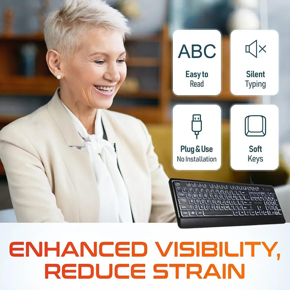 - Large-print buttons with backlighting enhance visibility and ease of typing, making this keyboard perfect for seniors or those with low eyesight