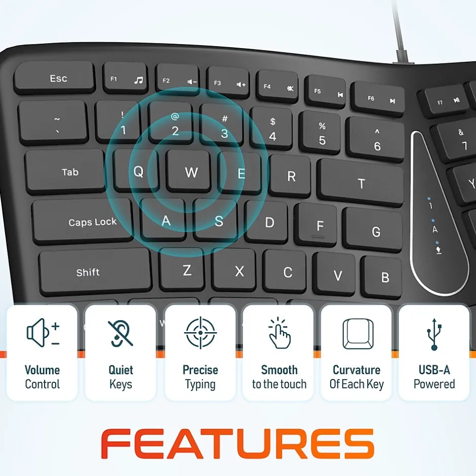 - Engineered with a gentle curve, this keyboard promotes a more natural hand position, reducing wrist strain and enhancing comfort for long periods of use