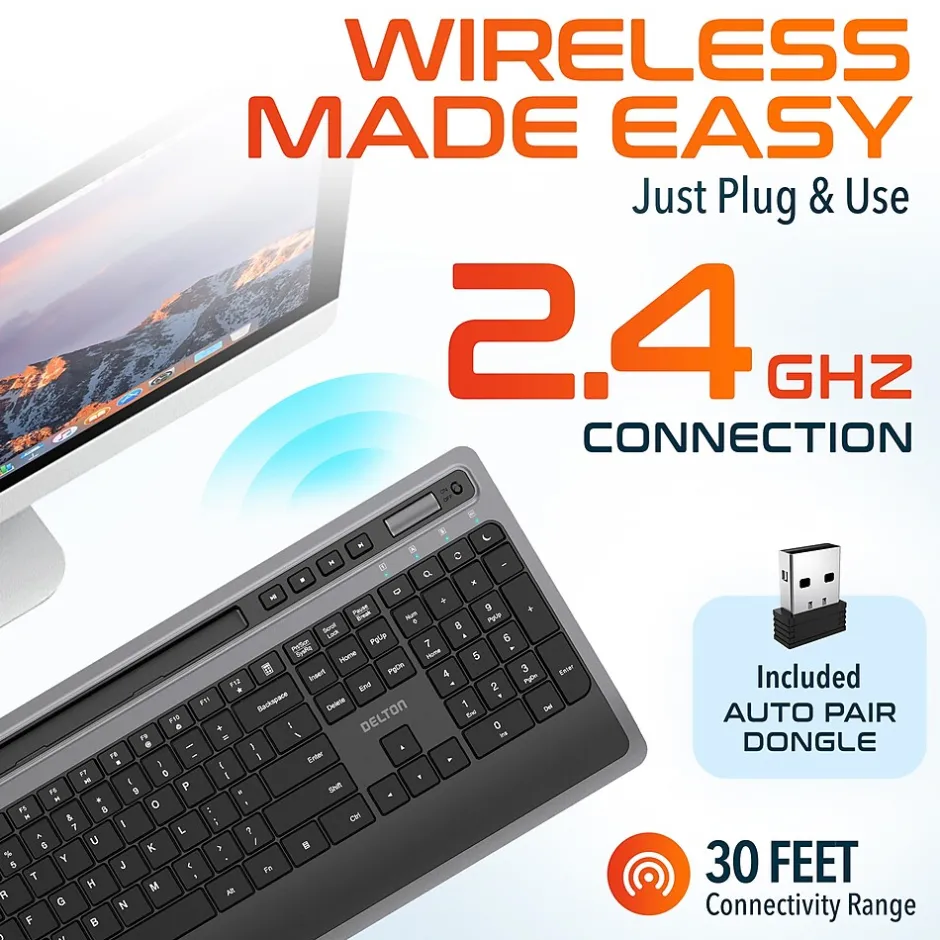 - Included in the package: Delton wireless keyboard, USB dongle, and user manual.