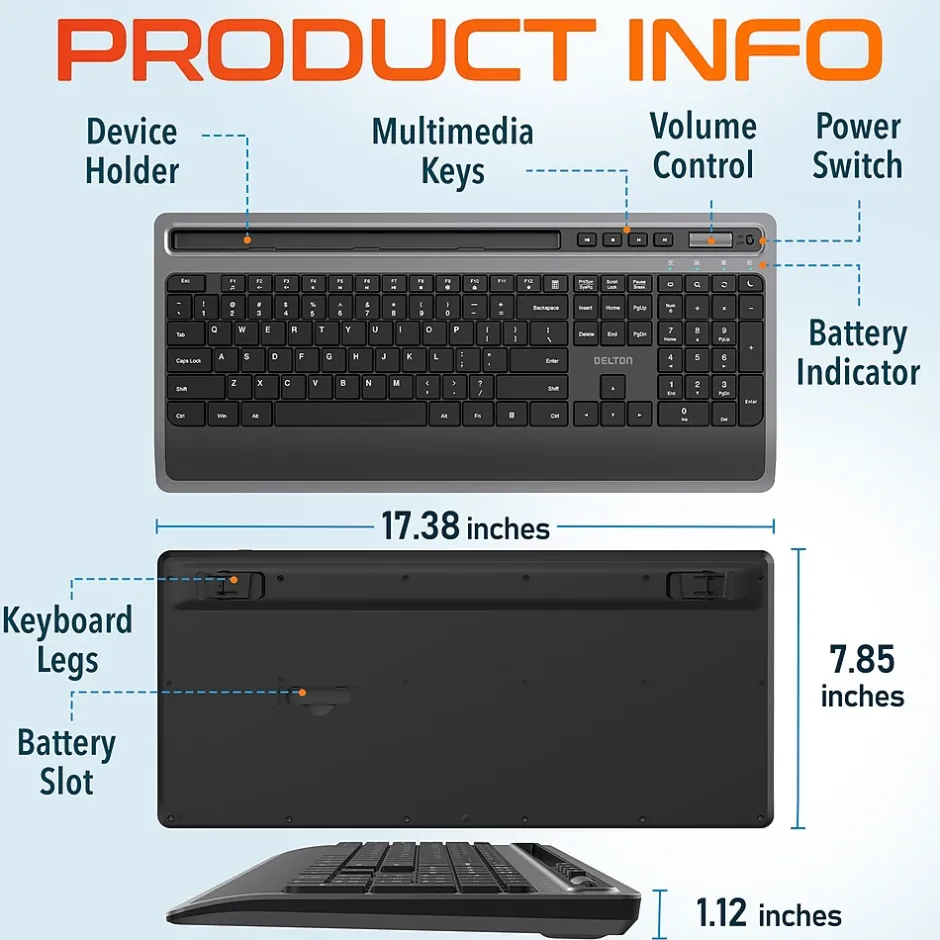- Measuring 17.38″ W x 1.12″ H x 7.86″ D, this keyboard wireless boasts a spacious layout for comfortable typing and fits neatly on your desk.