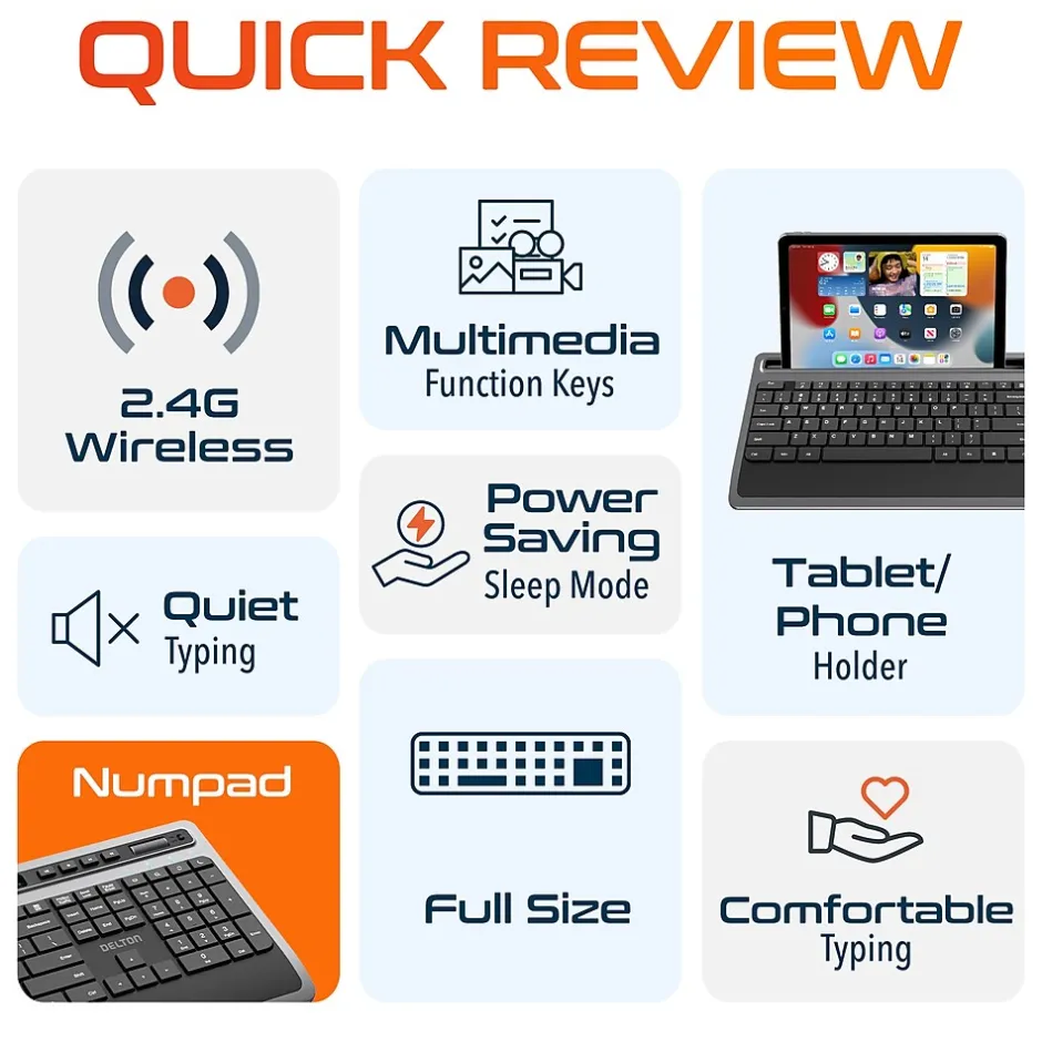 Elevate your typing experience with Delton T42 ergonomic keyboard wireless, designed for ultimate comfort and efficiency. Featuring a stable 2.4GHz wireless connection with a range of up to 30 feet, this office keyboard ensures smooth and uninterrupted performance. The full-sized 114-key layout of the wireless keyboard for laptops includes a numpad and 12 USB dedicated multimedia keys, allowing easy control of media and enhancing productivity. Enjoy the convenience of auto power-saving mode that activates after 10 minutes of inactivity and instant wake-up with a simple button click. This cordless keyboard seamlessly connects with PCs, laptops, and tablet PCs and is compatible with Windows, iOS, MacOS, and Linux, ensuring flexibility across multiple platforms. The full size wireless keyboard measures 17.38 wide, 1.12 high, and 7.86 deep, offering spacious and portability. Weighing only 1.57 lbs., this silent keyboard is lightweight, making it easy to move and handle.