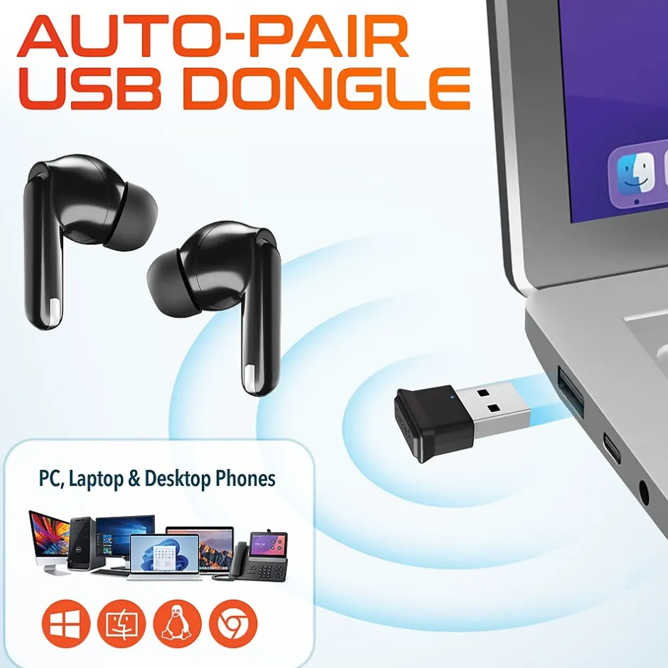 - Box contains: headset, charging and storage case, auto-pairing USB dongle, charging cable