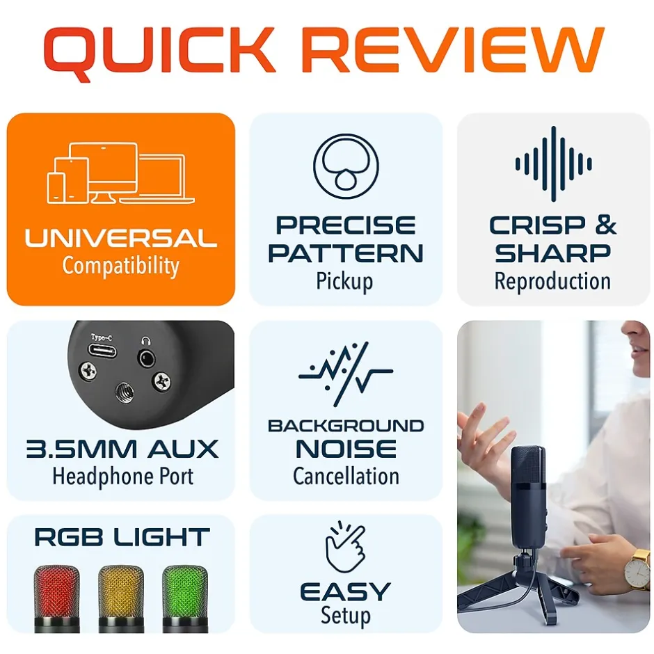 Transform your workspace with our RGB wired microphone, featuring vibrant, color-cycling lighting that adds a dynamic touch to your setup. This desktop microphone is compatible with a range of devices including Windows, MacOS, IOS, Android, desktops and laptops. Equipped with function buttons for Green Light (Work), Red Light (Mute), and Blue Light (Noise Reduction), this pc microphone ensures easy control of essential settings. Adjust microphone and earphone volumes independently for precise sound management. Enjoy hassle-free connections with Type-C and earphone interfaces, and achieve optimal positioning with 360° adjustable angles. This streaming mic is ideal for soundproof studios, ensuring sensitive sound with excellent frequency response. The microphone for laptop includes a mounting tripod and pop filter, enhancing stability and reducing plosives. Our condenser microphones are ideal for professionals, office workers, and more, providing dependable performance and clear audio.