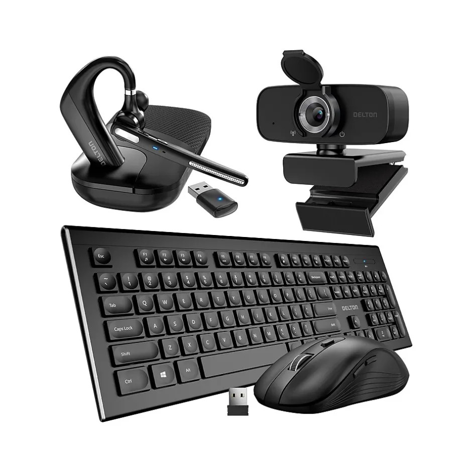 The Delton Work Anywhere 90X kit is designed to get you up and running and ready for business. This wireless four-in-one bundle includes a reliable 90X ultralight wireless Bluetooth headset, with a powerful battery and outstanding noise-canceling chipset, a wireless full-size keyboard, a wireless six-button mouse, and a 1080p 30 fps USB webcam. Delton listened to your feedback and created a kit that’s designed to get you working quickly. No software installations are needed, just plug and use. Each tool is adjustable for maximum comfort, has intuitive controls, and a long-lasting battery: all the features you need to get the job done.