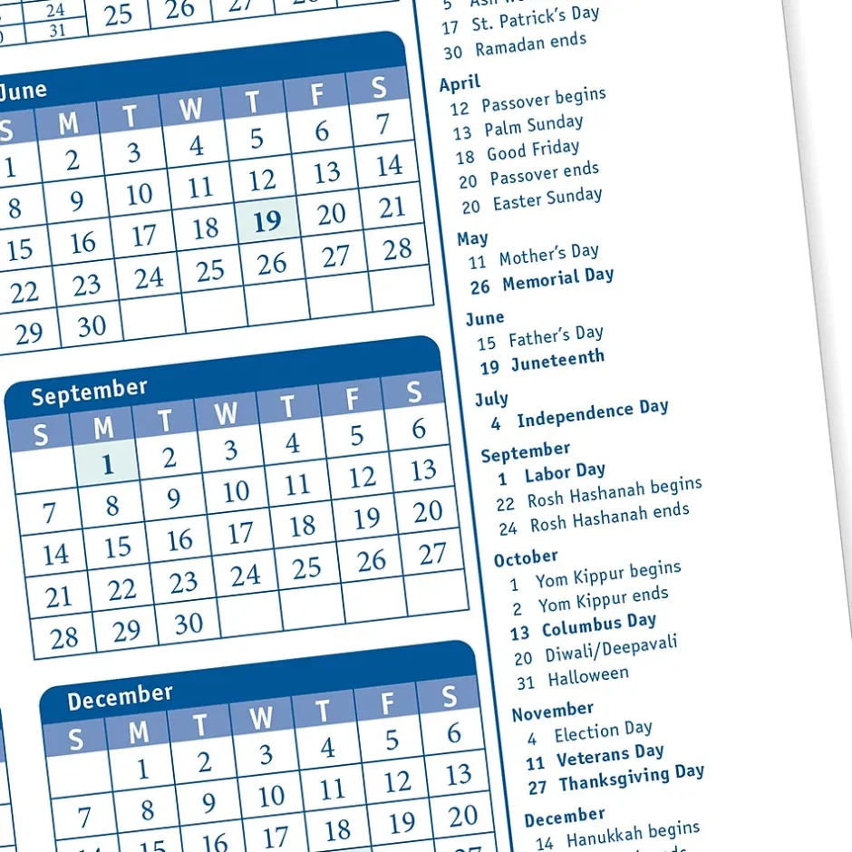 - Calendar includes holiday list with legal public holidays shaded