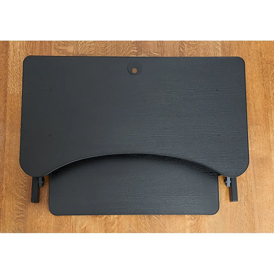 - Retractable ergonomic keyboard tray: Keyboard tray extends and retracts while keeping a 4.5″ spacing between keyboard tray and desktop which helps keep arms and wrists in an ergonomic position to prevent neck and back strain while sitting or standing.