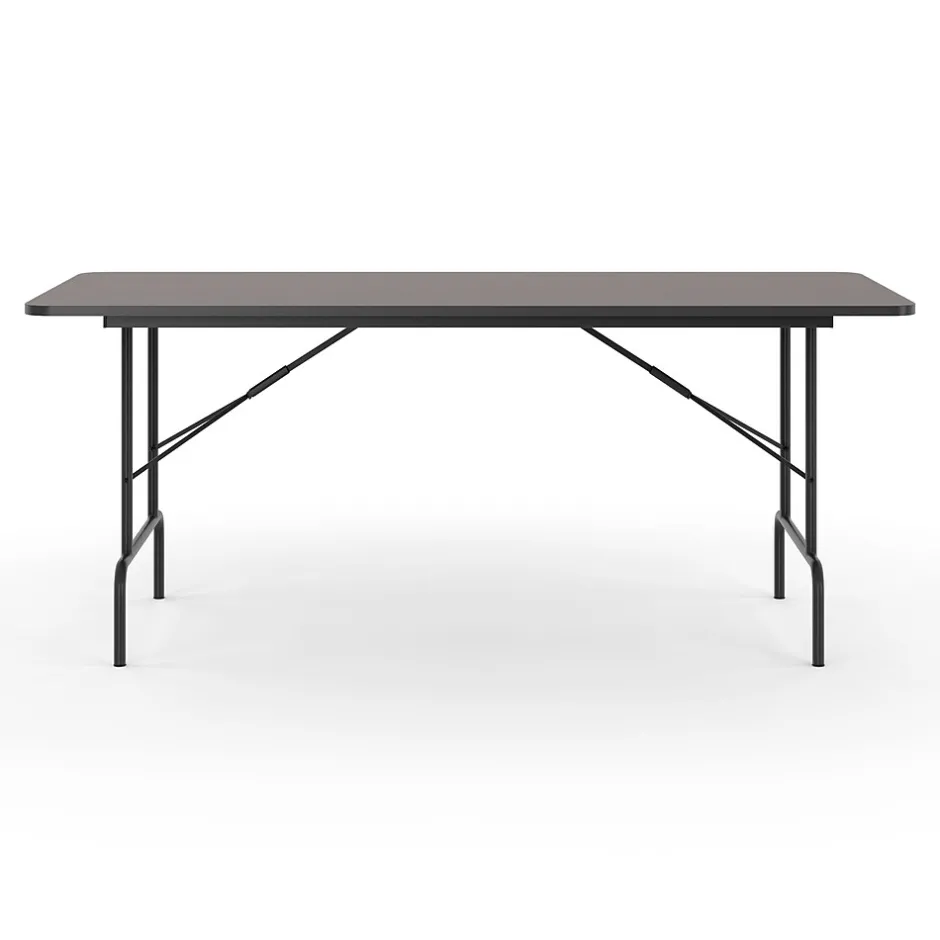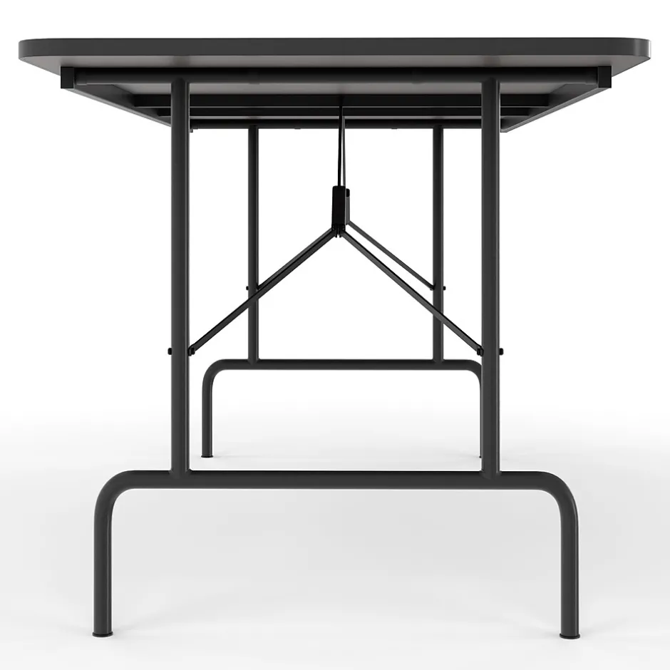 Bring flexible work or dining space to your building with this rectangle folding table. The sturdy metal frame and gravity legs offer added stability and strength, while the melamine tabletop stands up to frequent use. This table boasts a walnut finish for a professional appearance. A folding design delivers convenient storage, so you can stash this table away in between uses. Featuring a simple design, this melamine folding table provides quick, easy assembly.