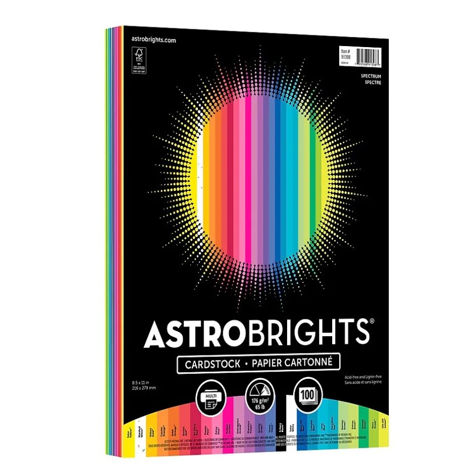 Let your imagination take off with Astrobrights colored cardstock, in Spectrum 25-Color Assortment. Creative geniuses and novices alike can create flyers, invitations, presentation covers, scrapbooking, school projects and DIY paper crafting. Display and store projects with confidence, since each sheet is lignin and acid-free. Plus, this cardstock works well with copiers, inkjet, and laser printers. Astrobrights cardstock is also compatible with electronic cutting machines so you can create intricate letters, shapes and other designs. Save money on pricey full-color ink – just add black ink! Brighter Colors. Brighter Ideas.
