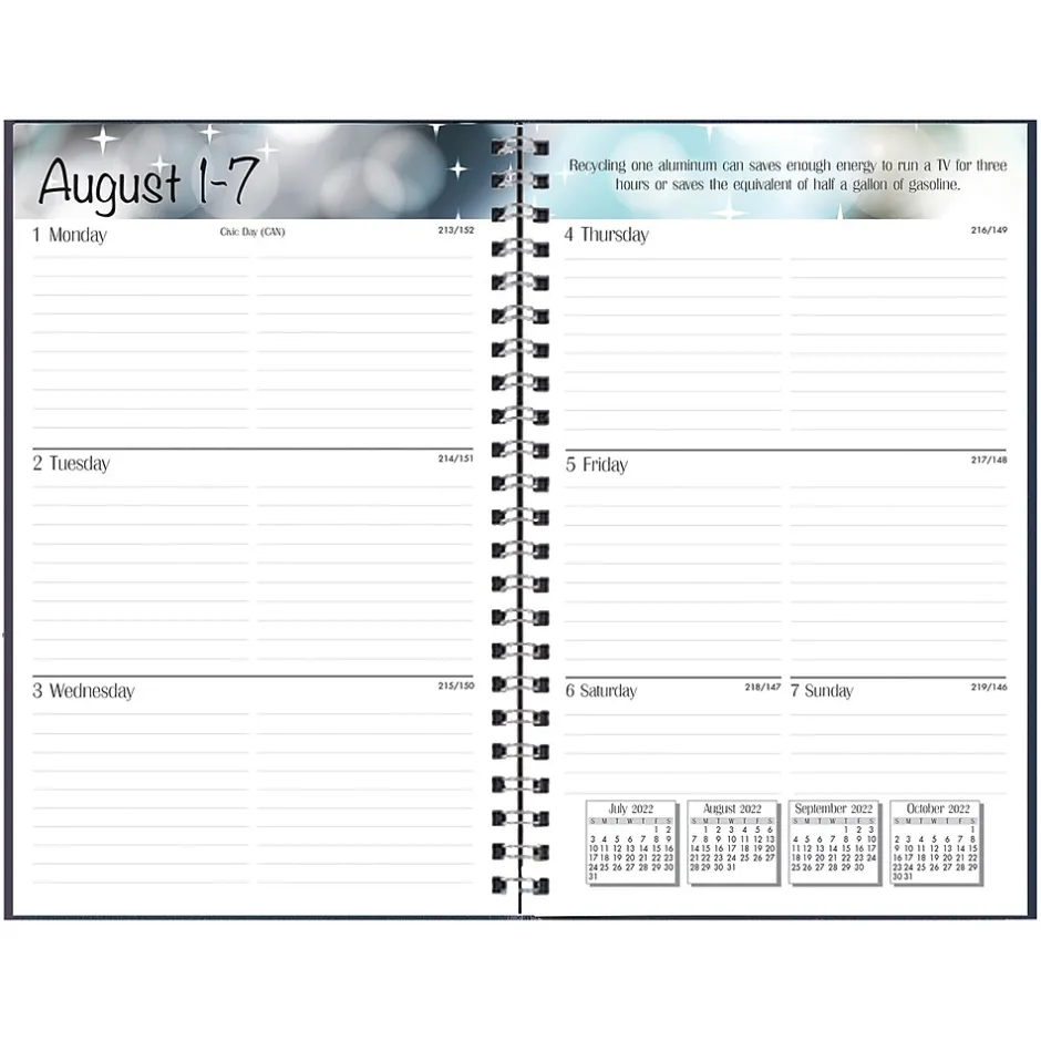 An ideal assignment book that is designed for a student in high school or college printed in full color. Each planner includes 13 Months: August – August. One week per two-page spread for high school and college students. Extra pages feature US Presidents, State Capitals, parts of speech, commonly confused words listing etc. Black leatherette cover. Academic and environmental pages. Printed on 100% post-consumer recycled paper with soy ink. Measures: 5″ x 8″. Sold as a pack of 3 identical books.