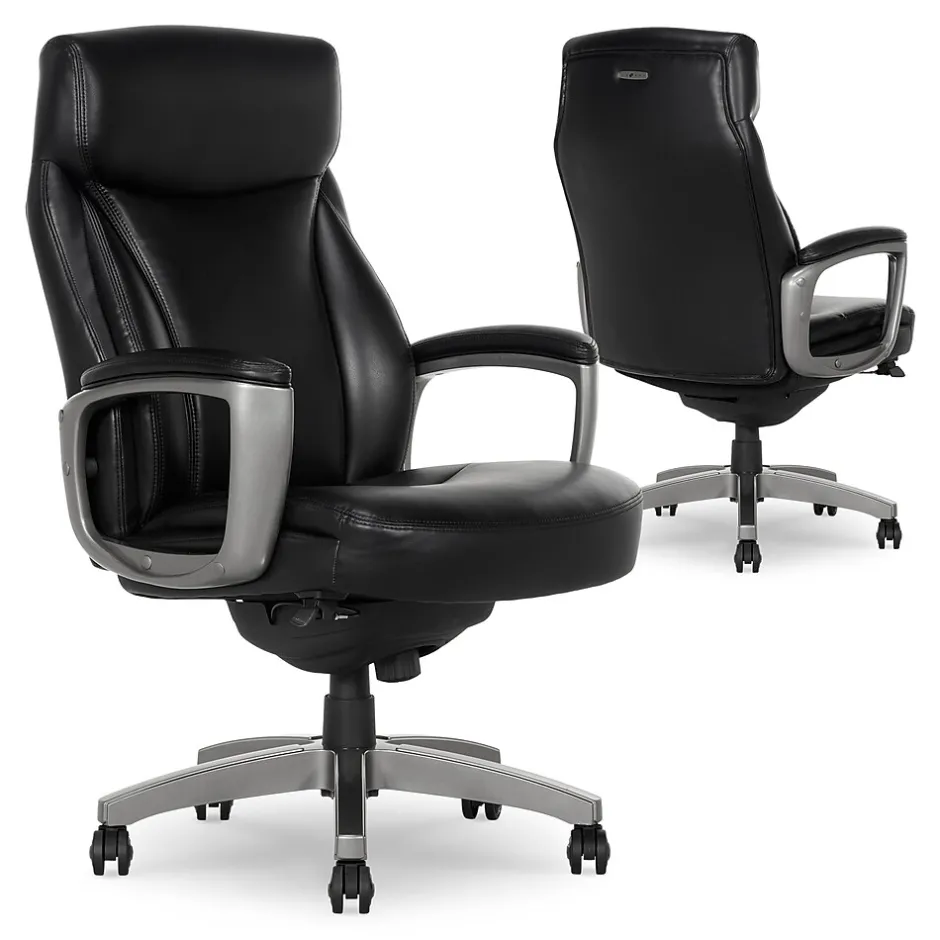 - Upholstered in black soft bonded leather seating surfaces