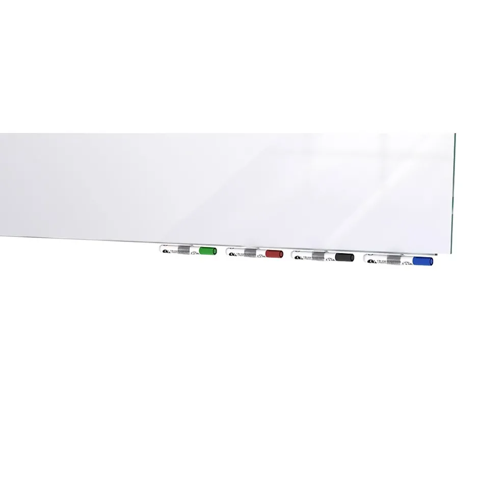 Aria Low Profile Glass Whiteboards achieve the look of weightless, floating glass. No visible hanging hardware or stand-offs allow the beauty of the frameless glass to complement any décor creating an unobstructed writing surface. Our team of engineers developed a heavy-duty hanging system that promotes security and confidence in the installation of your low profile glass whiteboard. With Aria glassboards, you can be confident your board will never bow, strain, or move from the wall. Aria can be hung on a variety of surfaces including, but not limited to, drywall, concrete and brick surfaces.Because of the unique hanging system, Aria glass whiteboards can be ordered specifically to hang in portrait or landscape positions depending on space and preference. Aria can be used as a single board for personal offices and conferences rooms, or create a glass whiteboard wall by lining up multiple glassboards in a row. Aria is constructed using premium ¼” tempered glass and when installed, floats just ½” from the wall. The lower steel support bar doubles as integrated magnetic marker storage, keeping the writing surface free from clutter. Available in 13 standard colors as well as non-magnetic and magnetic glass. Ships to you in Ghent’s worry-free packaging, designed specifically for shipping whiteboards.Comes with 4 markers and an eraser. Ghent’s full line of glass whiteboards, including Aria, carries a 50-year warranty and is made in the USA.