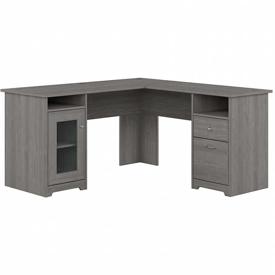 The Bush Furniture Cabot 60W L Shaped Computer Desk with Storage presents a home office solution with transitional style. Take advantage of the spacious L Shaped Desk surface to spread out with the materials you need to power through your next project or assignment. The durable desktop supports up to 200 pounds and has built-in wire management to keep cords and cables out of the way while you work. Organize materials inside a storage cabinet with one adjustable shelf behind a fluted glass door. The file drawer opens on smooth full-extension ball bearing slides for an effortless reach to letter, legal, and A4-size paperwork. A box drawer and two open cubby spaces are ideal for work-in-progress and frequently used items. This corner desk with drawers and storage has been rigorously tested to meet or exceed ANSI/SOHO standards for safety and performance and is backed by a 1 Year Warranty.