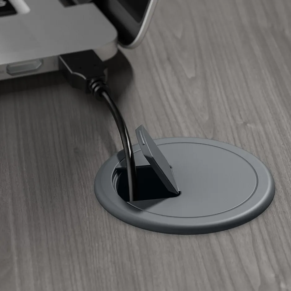 - L Desk’s surface features built-in wire management grommets to keep cords and cables out of the way