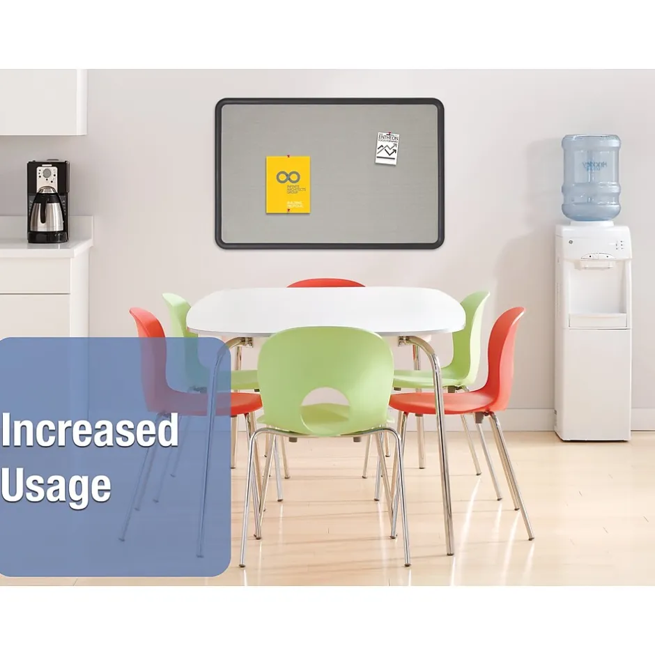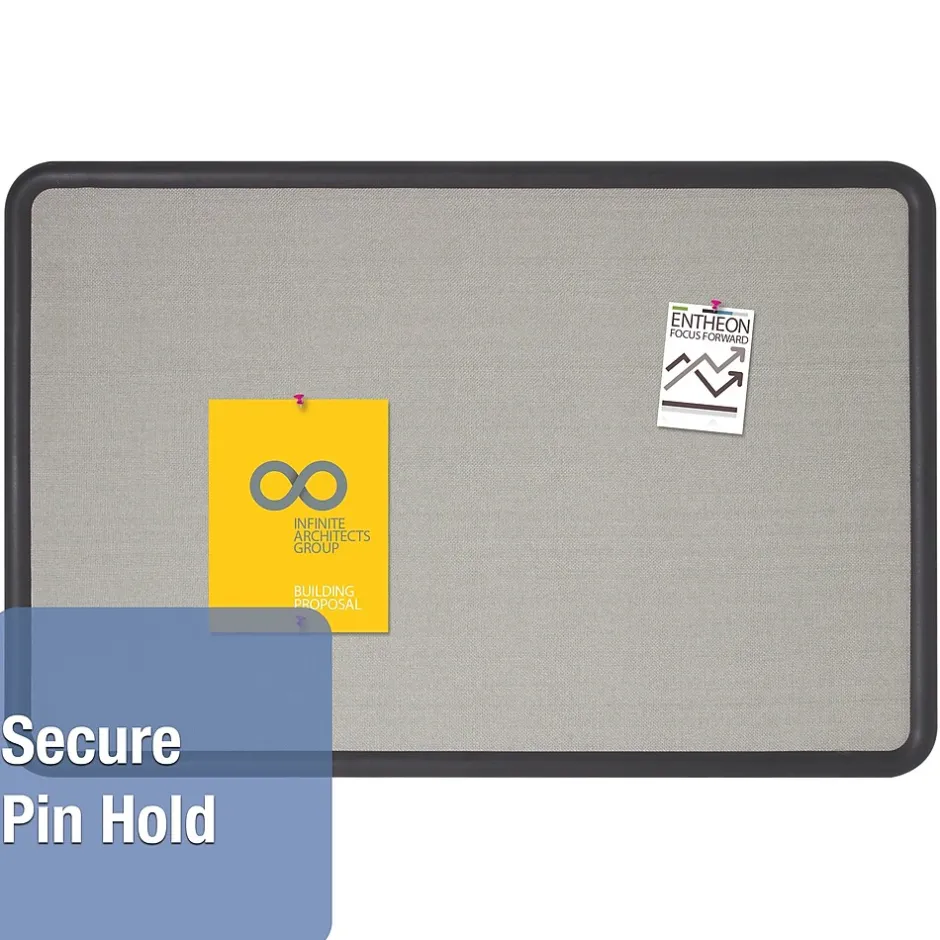 Hang this Quartet Contour 2′ x 3′ bulletin board in high-traffic areas for an easy way to display flyers, notices, and more. The durable gray woven fabric surface is self healing and backed by high-density fiberboard to keep pins secure even after repeated use. This bulletin board features a lightweight, gray, plastic frame with rounded edges.