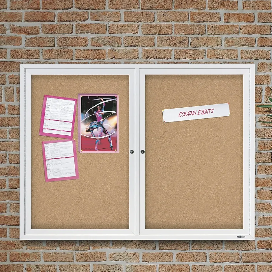 Reach desired audiences by presenting newsletters, announcements, and pictures on this enclosed cork bulletin board. Two locking, swinging doors and shatterproof tempered glass enclose this bulletin board, keeping publications safe and secure. The self-healing cork and aluminum casing on this bulletin board offer long-lasting durability. This Quartet cork bulletin board has a vented frame to keep moisture at bay, allowing for clear viewing.