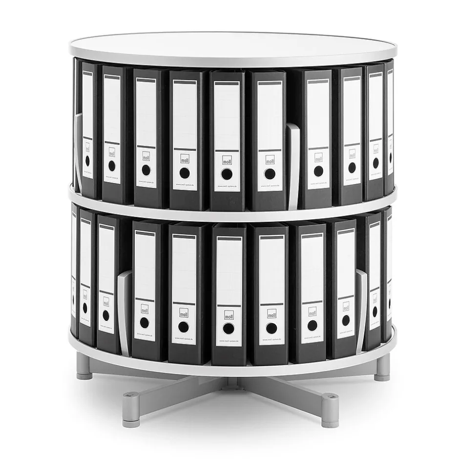 MollĀ® Two-tier binder and file storage carousel features 32″ diameter unit which offers abundant storage in a small area. Carousel shelf is protected with a hard rubber edge banding. Also seen in picture Top storage carousel (Item 277944) and Caster base (Item 277729) sold separately