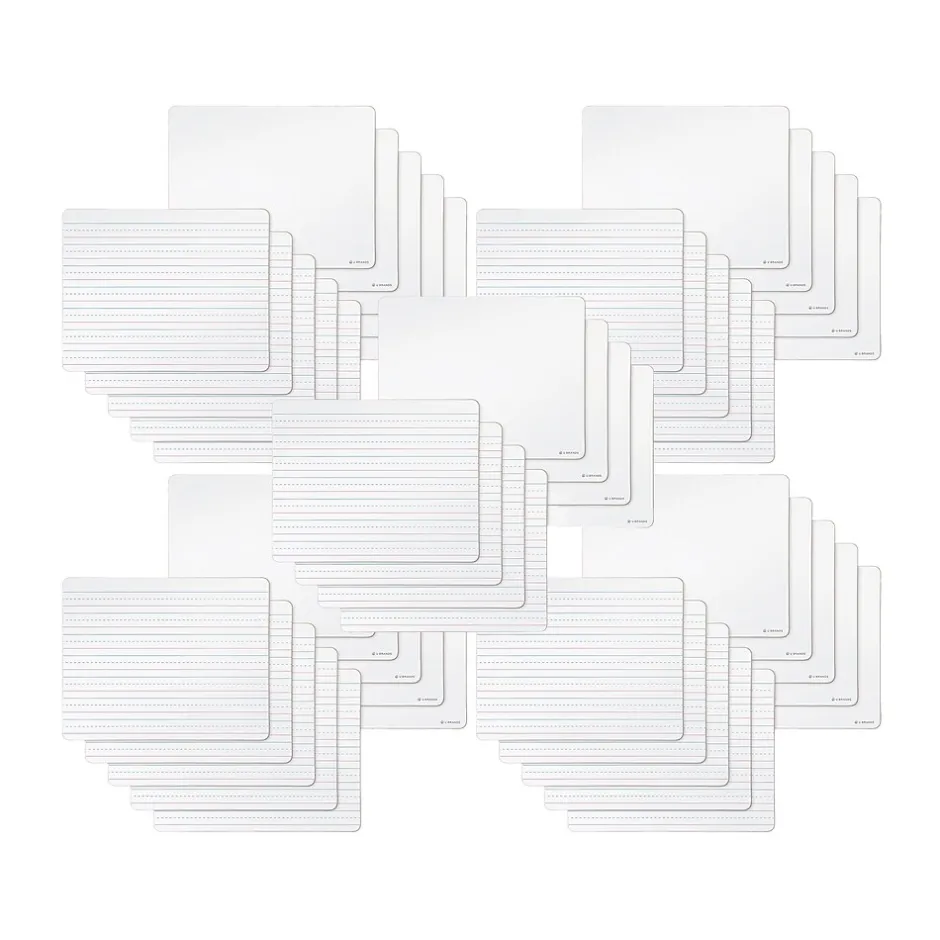 This dry-erase personal lap board is double-sided, enabling the child to practice and learn everything from printing block letters, writing cursive, doing math, drawing pictures, and expressing their own creativity. The reusable dry-erase surface is perfect to practice the alphabet, addition, subtraction, multiplication, and division on the go. This double-sided whiteboard is a perfect tool for teachers to ask students to solve problems individually and hold the answers up high to share with the teacher and the classroom. The dry-erase surface is ghost- and fade-resistant to ensure longevity after repeated frequent use. The front side of the board features a lined surface to learn and practice letters, words, and sentences. The back side of the board is blank with a dry-erase surface for endless activities, such as math problems, drawings, or other creative expressions. The white board features rounded corners, which is safe for use by children.