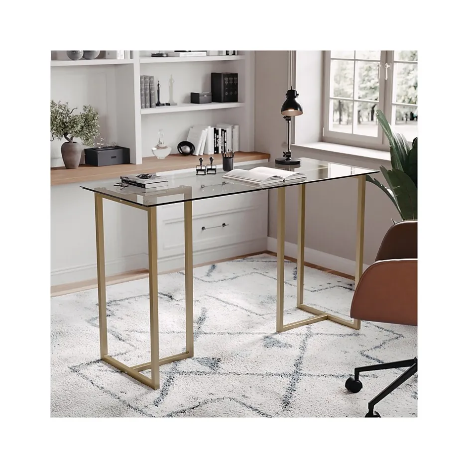 When creating your home office space, start with the focal point, your desk, which should be everything that you need to make your workday go smoother. This modern Martha Stewart Eli home office desk in a spacious open-frame design has an easy-to-clean tempered glass desktop with a powder-coated steel frame base in a polished brass finish.