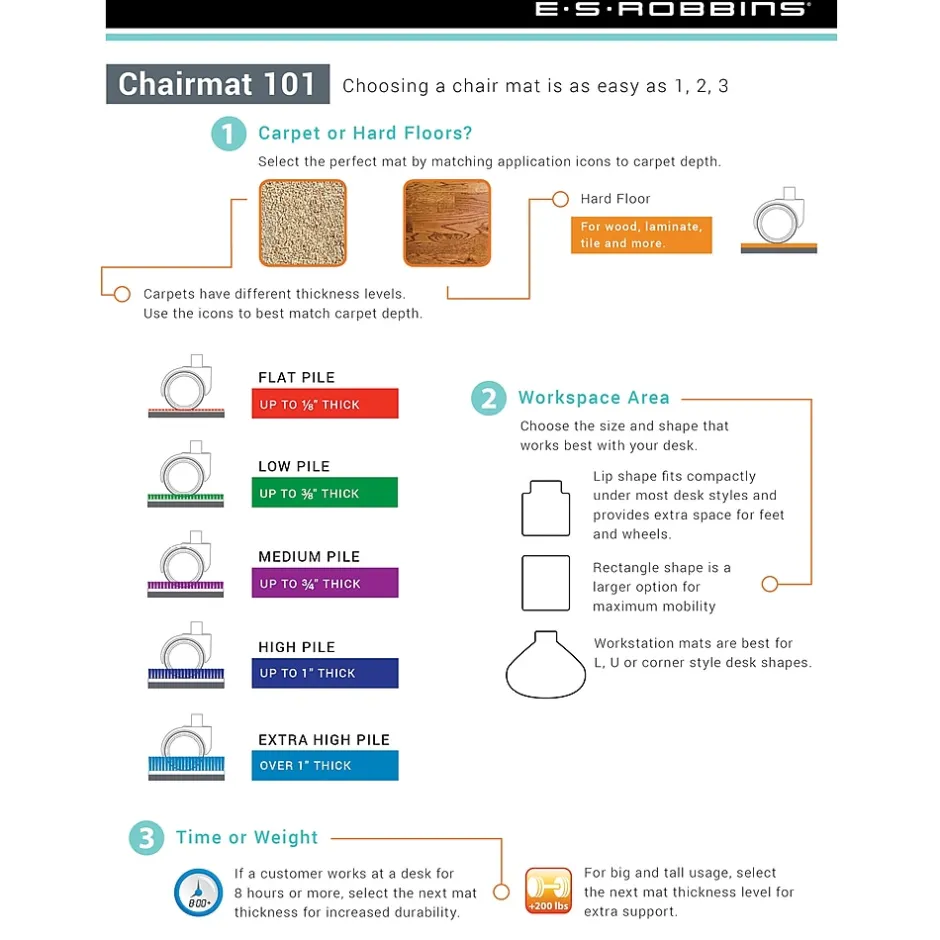 | Length in Inches Carpet Pile refers to the height (or depth) of the carpet. Chair mats are usually built with cleats on the bottom, which come in different lengths. The higher the carpet pile, the longer the cleats you’ll need for the chair mat. | Hard Floor |