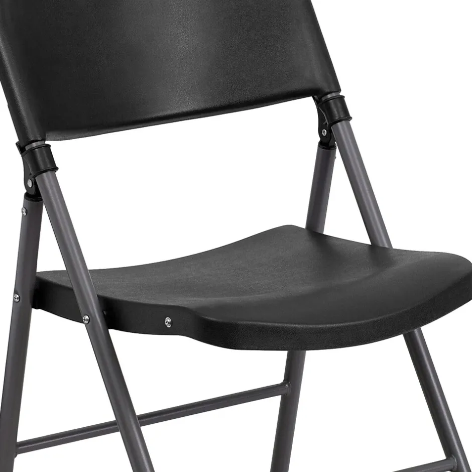 Flash Furniture HERCULES™ Series black eco-friendly plastic folding chair sold as 6 per pack features tubular steel frame with charcoal powder finish that enhances seat support. It nests easily for stacking.
