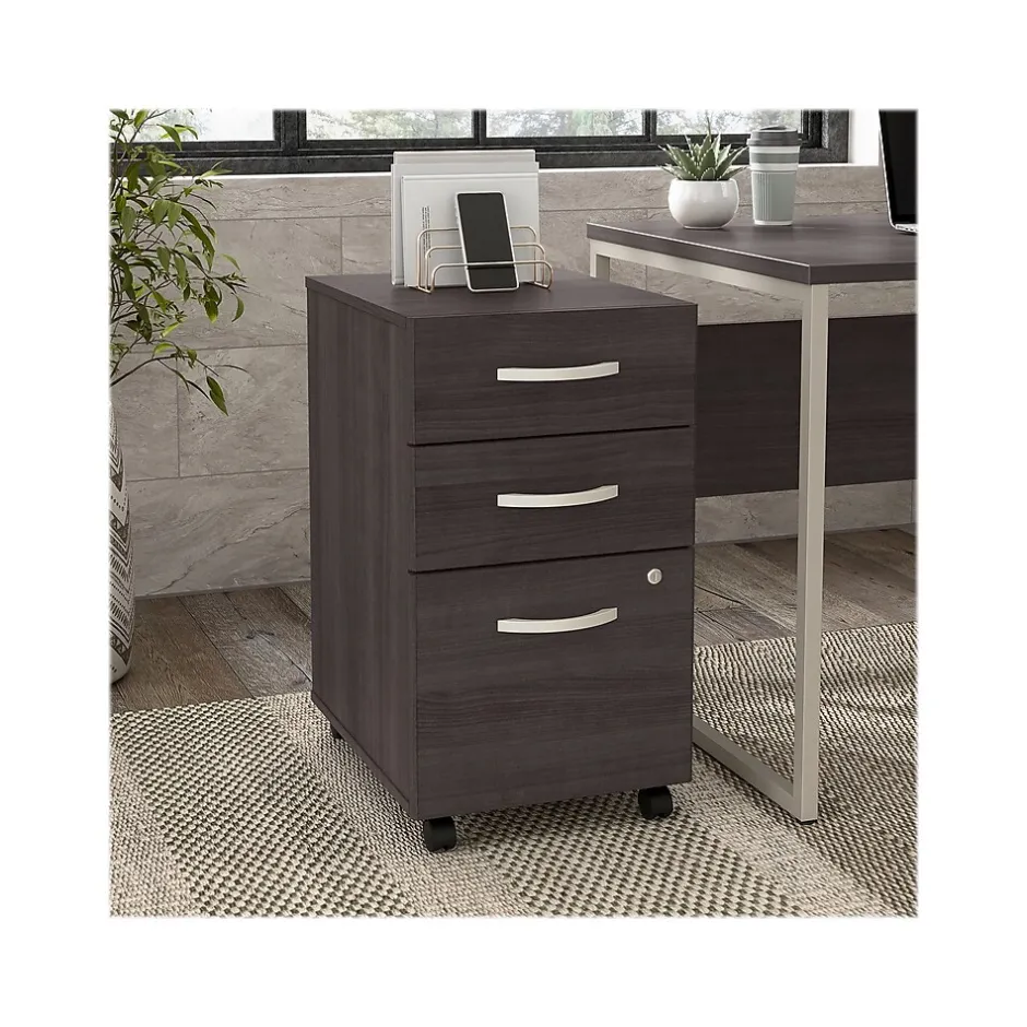 The Bush Business Furniture Hybrid three-drawer mobile file cabinet offers a stylish, long-lasting storage solution for the modern professional. Enjoy a neat and organized workspace with a file cabinet that conveniently rolls wherever you need access to important documents. The file drawer opens on smooth full-extension ball bearing slides for an effortless reach to letter, legal and A4-size paperwork, while a pair of box drawers organize writing utensils, notepads and more. The two bottom drawers can be secured by a single lock to protect sensitive files or personal items. The rolling file cabinet’s compact design allows it to fit underneath a standard-size office desk for a space-saving configuration. Find the perfect look for your space with five contemporary finish options: black walnut, modern hickory, platinum gray, storm gray, and white. This two-drawer file cabinet with wheels has been meticulously tested to meet or exceed ANSI/BIFMA quality standards for safety, durability, and performance and is backed by the Bush Business Furniture 10-year manufacturer warranty. See the full Hybrid collection for coordinating items to enhance your workspace as needed, including computer desks, bookcases, and storage cabinets (coordinating items sold separately). American-made with US and imported parts.
