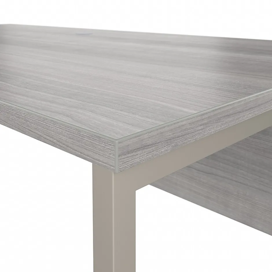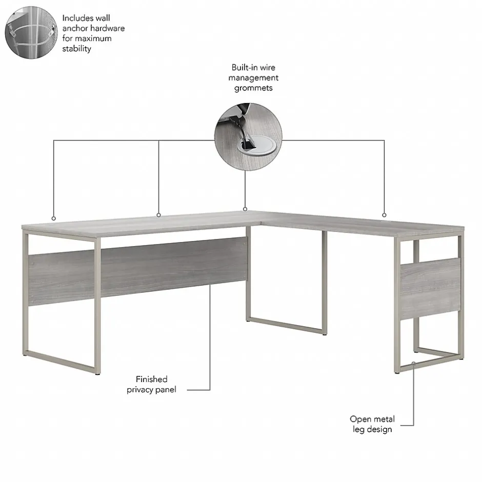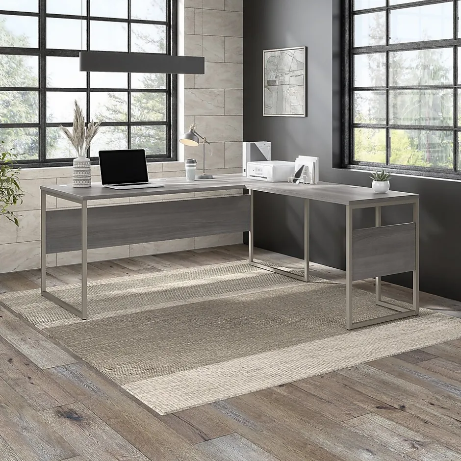 The Bush Business Furniture Hybrid L-shaped table desk blends a durable work surface with sturdy metal legs to offer a stylish, long-lasting solution for the modern professional. Tackle your next project or assignment with a computer, books, and more on a desktop that supports up to 200 lbs. Four built-in wire management grommets keep cords and cables in order, so your work area remains free from unnecessary clutter. The corner desk’s open leg design and finished privacy panel allows it to look great facing any direction in a home or professional office environment. This modern computer desk has been meticulously tested to meet or exceed the ANSI/BIFMA standards for safety, durability, and performance and is backed by a 10-year manufacturer warranty. American-made with US and imported parts.