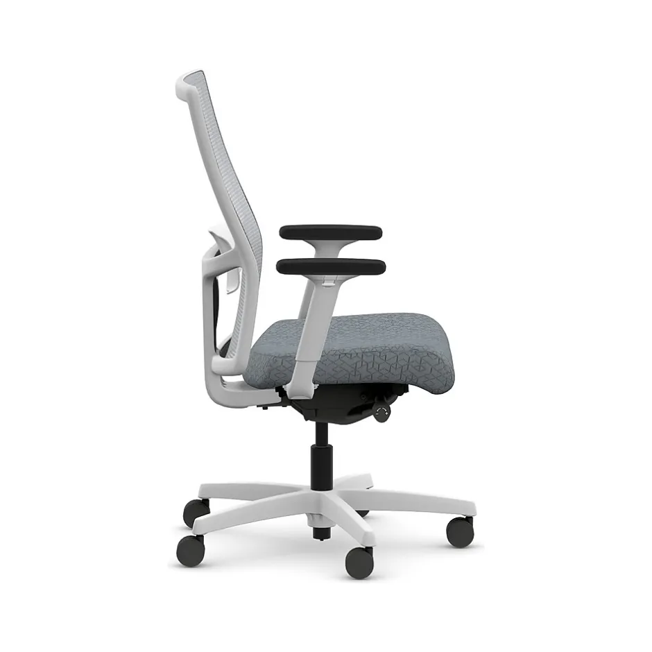 - Four-way stretch mesh back in fog gray, Apex basalt gray fabric seat, and designer white frame