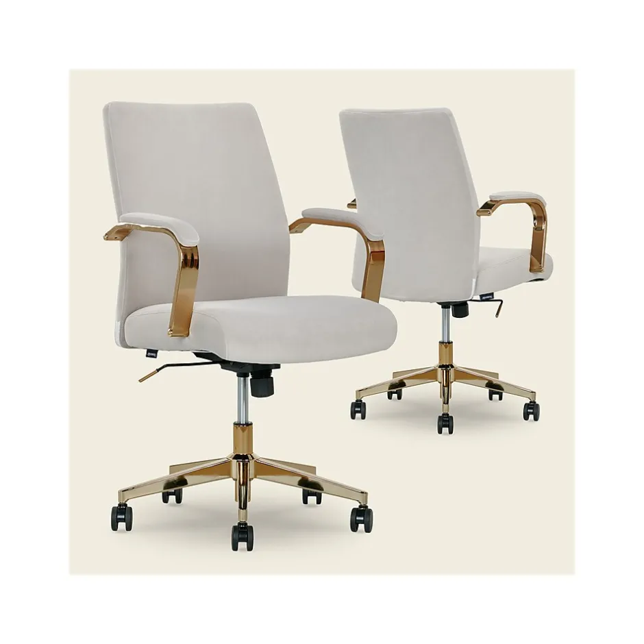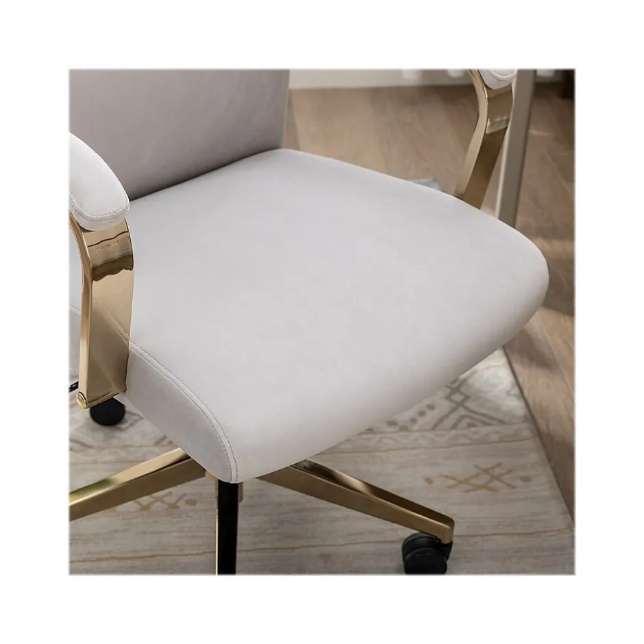 Featuring plush cushioning, clean lines, and a tailored silhouette, the Thomasville Furniture Jolie office chair is an inviting blend of comfort and style. With the velvety microsuede upholstery and metal frame in gold-tone plating, this office chair is well-suited to a range of decors. Ergonomic and adjustable, this modern desk chair is fitted with a pneumatic lift mechanism to control the seat height for optimized body alignment. Finished with sturdy rolling wheels, this executive office chair allows you to move quickly and efficiently. Bring sophisticated style to any office with this chair.
