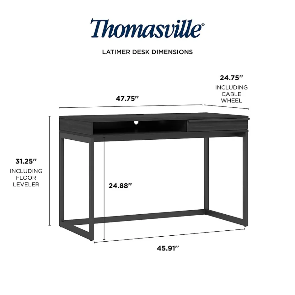 The modern styling of the Thomasville Furniture Latimer 48″ writing desk will give you something to look forward to work at every day, and the antimicrobial laminate surface will reduce the growth of bacteria on the desk surface. The 48″ width offers plenty of work space while not taking up too much floor space. The work surface will accommodate a monitor and keyboard, and you can store your laptop in the open shelf below. The storage drawer will also help keep your desktop clear of clutter. The power center will keep you conveniently connected with two outlets and two USB ports. The cord management grommet will keep your wires tidy and organized.