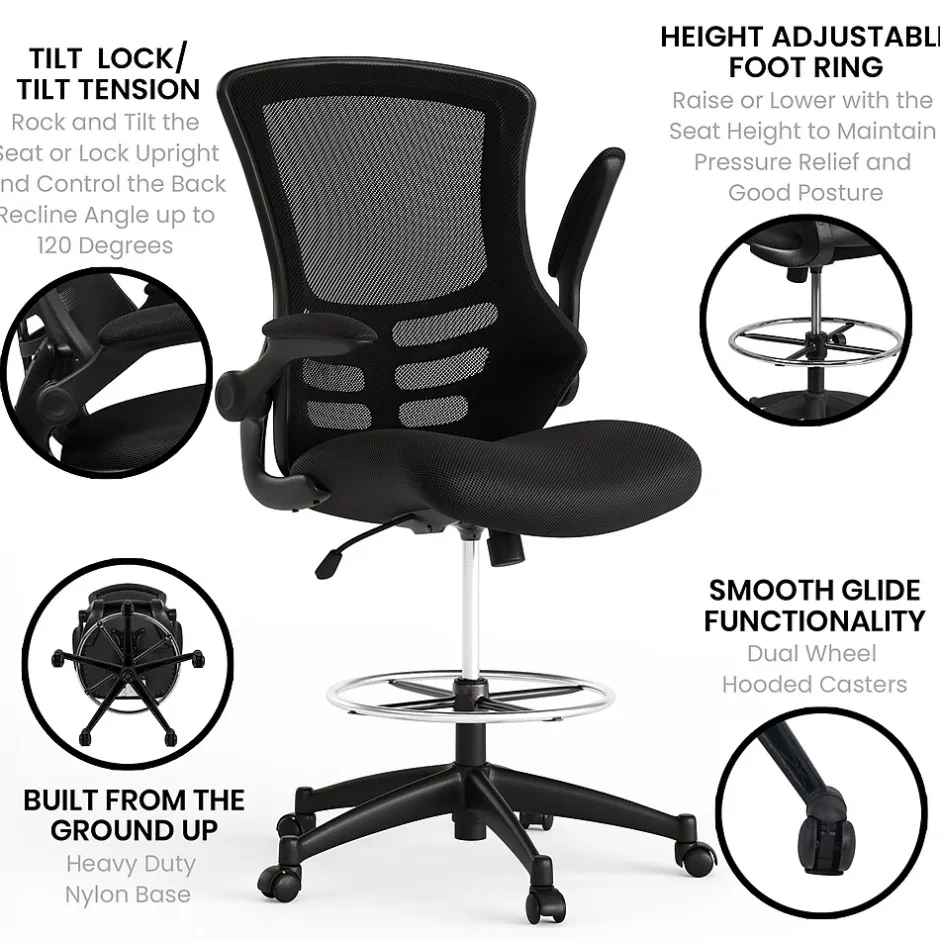 Experience the padded breathable mesh back and mid-back support of this chair. The adjustable foot ring keeps your legs supported and the tilt-lock mechanism allows the easy transition from a seated position to reclined one. This versatile drafting chair has flip-up arms that can be positioned out of the way when more space is needed and pneumatic seat-height adjustment, allowing it to fit under high or low tables and desks. With its swivel seat and built-in lumbar support, this Flash Furniture drafting chair is perfect for workspaces that require flexible and comfortable seating.