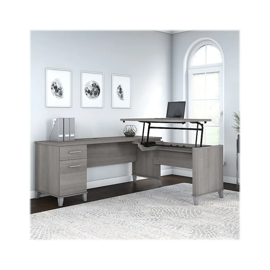 Upgrade your personal workspace with the ergonomic Bush Furniture Somerset 72″W three-position sit to stand L-shaped desk. As a quality alternative to desktop risers, the innovative sit to stand return offers all the health benefits of a standing desk with the versatility of electric height-adjustable options. The built-in mechanical Lift-n-Lock system allows the desktop to lock into place at standing heights of 35″, 38″, and 41″ and easily return to a seated position. This office desk includes a file drawer that opens on full-extension ball bearing slides for easy access to legal- and letter-size documents and a box drawer for supplies and utensils. Fixed surfaces are tested to meet ANSI/SOHO standards for safety and performance while the mechanical lift is rigorously tested to Bush Furniture quality standards.