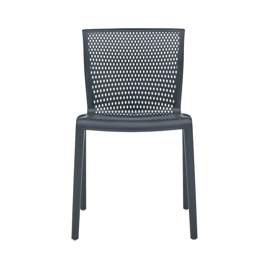 - Perforations in the chair seat and back provide drainage for outdoor environments