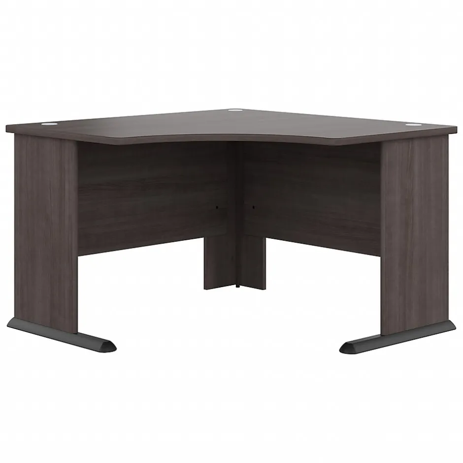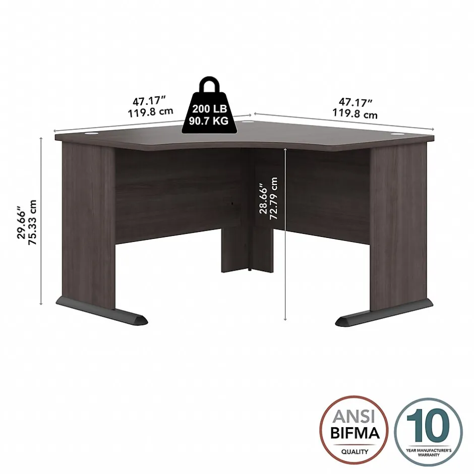 The Bush Business Furniture Studio A 48″W corner computer desk combines a fresh contemporary appearance with the commercial-quality construction needed to withstand years of everyday use. Conveniently designed to be placed in a corner of your choosing, this compact desk is a perfect choice for working or gaming where space is limited. Set up with a computer and equipment on the durable desktop that supports up to 200 lbs. Three built-in wire management grommets keep cords and cables in order, so the surface remains free from unnecessary clutter. Wall attachment hardware is included for maximum safety and security in any home or professional office. This small corner desk has been meticulously tested to meet or exceed the ANSI/BIFMA quality standards for safety, durability, and performance and is backed by a 10-year manufacturer warranty. American-made with US and imported parts.