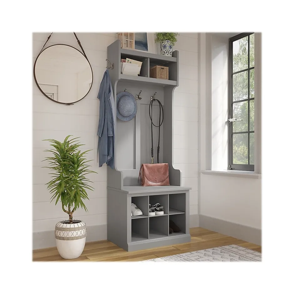 The Bush Furniture Woodland 24W Hall Tree and Small Shoe Bench with Shelves combines transitional styling and a practical design to offer an ideal entryway organizer. Have a seat on the durable bench and take a moment to relax as you get ready to head out the door or come home after a long day. The top of the mudroom bench supports up to 250 pounds, so you can sit down to put on and take off your shoes or set bags down with confidence. Six built-in cubby spaces keep your home organized while providing easy access to footwear. The narrow Hall Tree features three coat hooks in the front and one on each side for hanging jackets, hats, and more. Smaller items like gloves and keys can be stashed inside two open compartments. This entryway bench with storage has been rigorously tested to meet Bush Furniture’s standards for safety, performance and durability and is backed by a 3 Year Warranty.