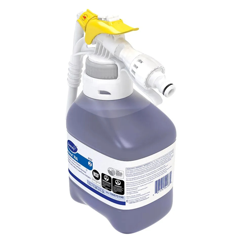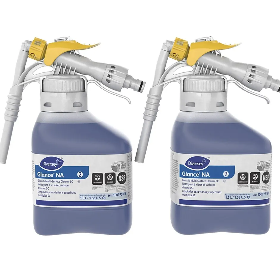 The Diversey Glance NA super concentrated, streak-free, non-ammoniated glass cleaner meets ECOLOGO and Greenguard standards. Use on most washable surfaces, including chrome, stainless steel, bathroom fixtures, and laminate countertops. Blue in color with no fragrance added.