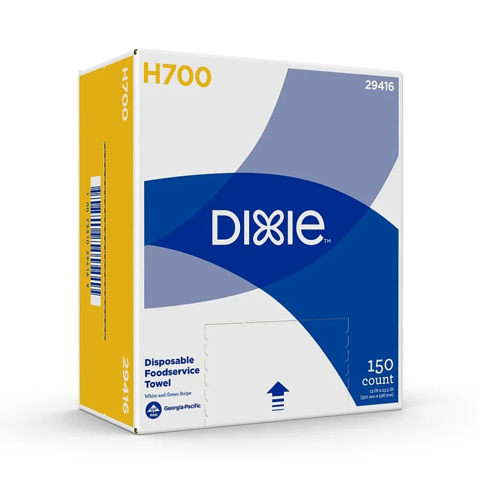 The Dixie strong, soft, thick and absorbent foodservice towel is engineered from super strong hydro entangled fibers that make it perfect for front or back of the house cleaning. These white with green stripe, medium duty towels deliver superior cloth-like cleaning to handle almost any job and are especially designed for fast, streak-free wiping on messy tabletops, grimy countertops, and even the greasiest stove tops. You name it-this wiper can handle it. Long-lasting, machine-washable towels come in a convenient dispenser box for added protection and quick, easy dispensing.