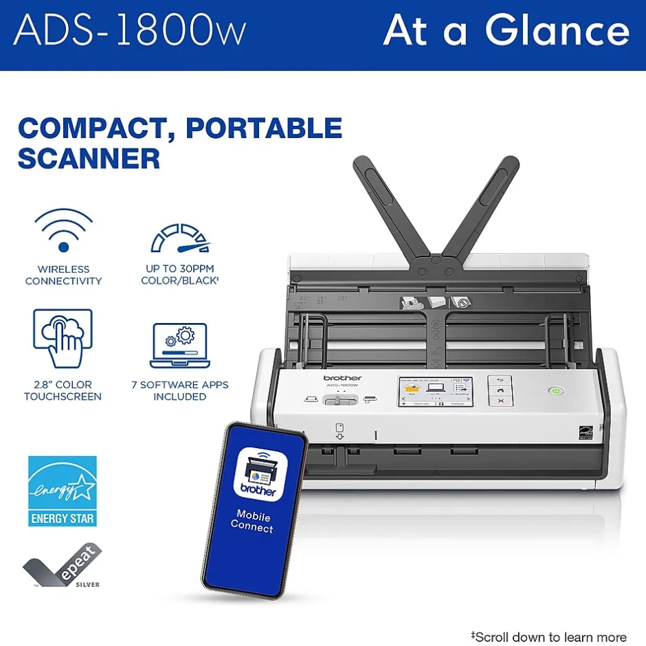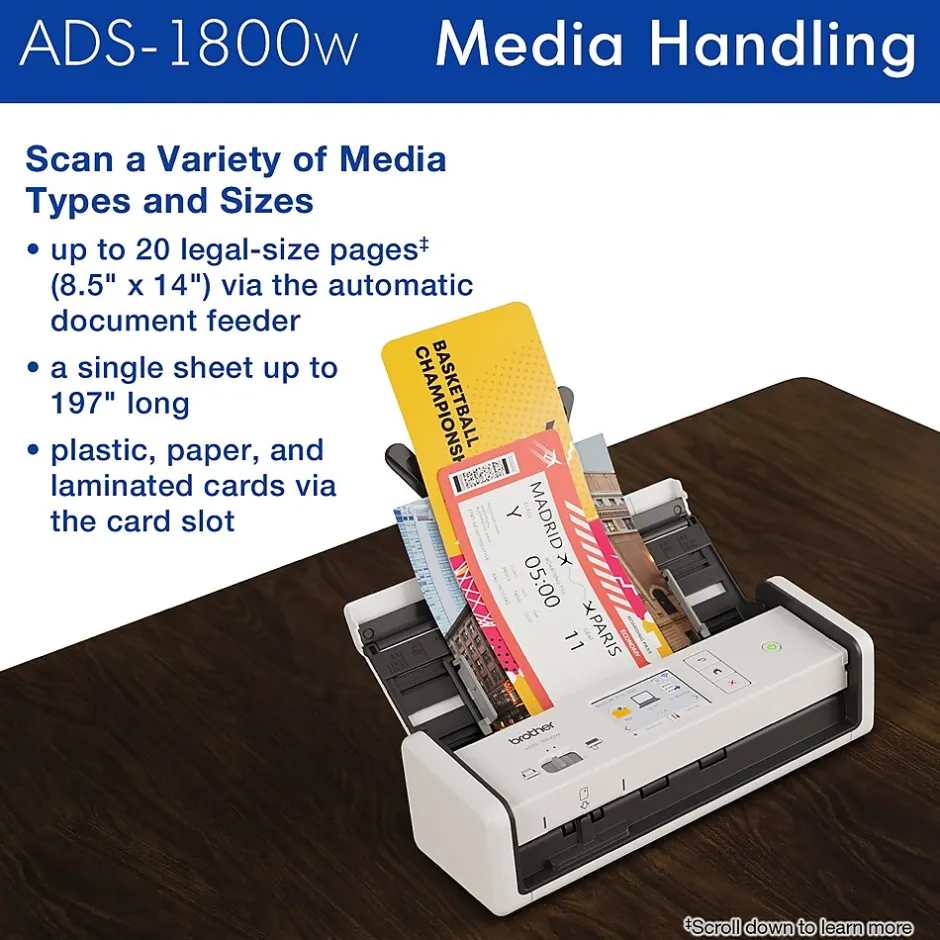 Great for scanning in the office or on the go, the Brother ADS-1800W scanner easily handles a wide variety of document sizes, scanning single pages as long as 197″ or multiple pages up to 8.5″ x 14″ with the 20-page automatic document feeder(1). It even includes a handy card slot for simple scanning of ID cards, business cards, or plastic cards of all kinds. Scan what you want, your way, almost anywhere – from your desktop, or using the free Brother Mobile Connect App(2) from your smartphone when connected to your scanner over a Wi-Fi connection. The handy 2.8” color touchscreen makes scanning even simpler, letting you scan to preset destinations, create shortcuts, and easily manage your scanner settings. Save directly to your favorite cloud service(3), or send to your computer, email, or USB flash drive. You won’t believe the time – and space – you’ll save with fast scanning speeds up to 30 pages per minute (ppm)(4), and single-pass double-sided scanning capabilities. Directly powered from your computer via an included USB-C cable, the Brother ADS-1800W is compatible with Windows, Mac®, and Linux® operating systems, offering TWAIN, WIA, ICA, and SANE drivers. It’s also ENERGY STAR 3.0 and EPEAT SILVER certified, with energy efficient options like Sleep Mode. It’s so simple to use, you’ll ask yourself how you ever organized without it.