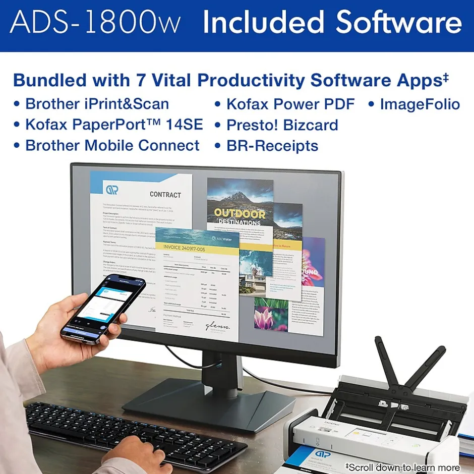 - ADDED VALUE WITH BUNDLED SOFTWARE. Includes 7 vital productivity software apps(2) to enhance and organize your scans: Brother iPrint&Scan, Kofax PaperPort™ 14SE, Kofax Power PDF, Brother Mobile Connect, Bizcard, BR-Receipts, and Image folio.