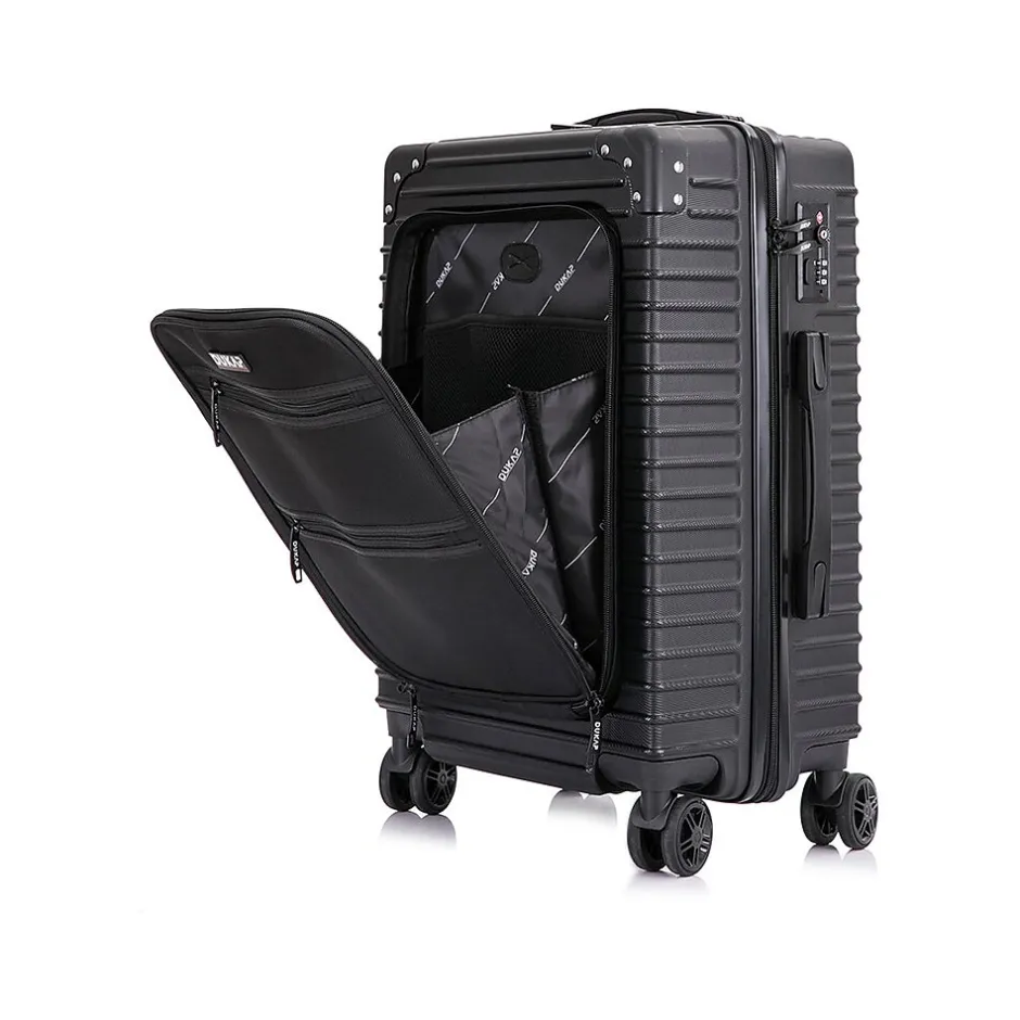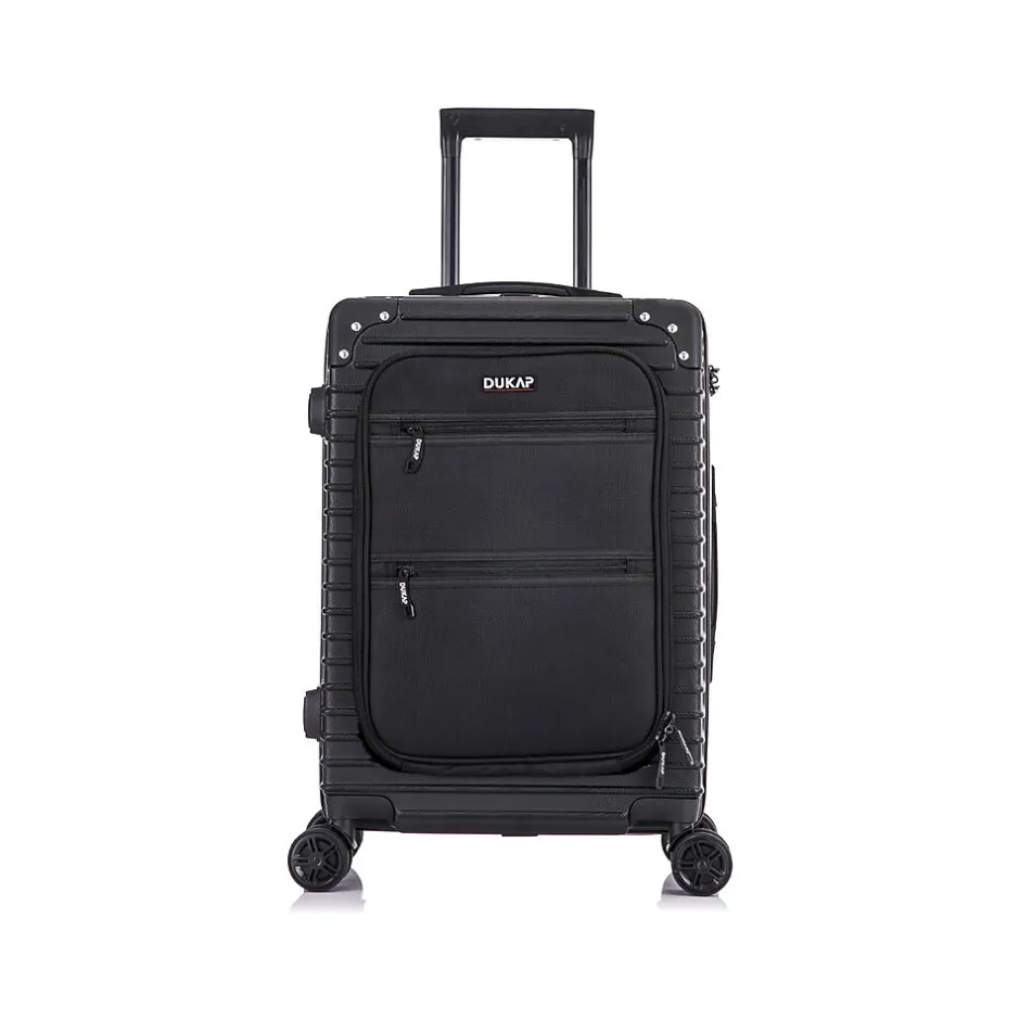 The DUKAP Tour hardside spinner carry-on luggage is a durable and practical travel choice. This luggage offers convenience and security with a front pocket for your laptop and interior pockets for essentials, four spinner wheels, a TSA-approved lock, and an integrated USB port. The interior is fully lined with various compartments, and the luggage has protective corner bumpers and ergonomic handles for easy lifting.
