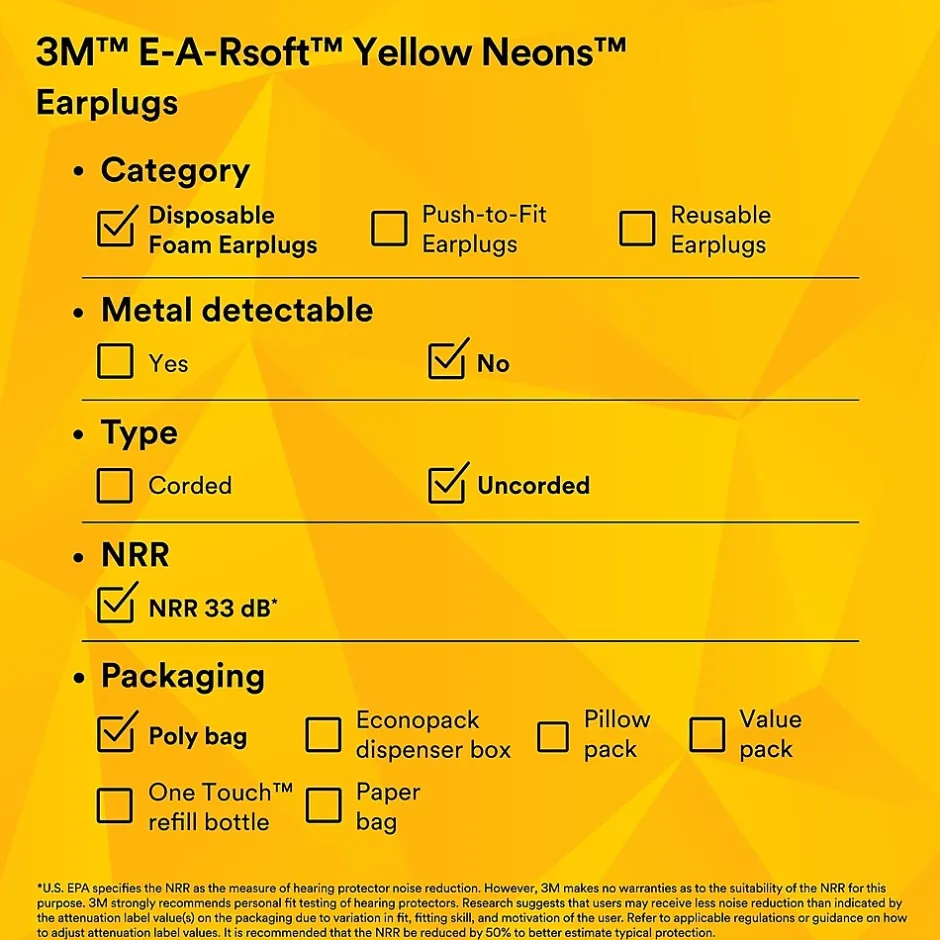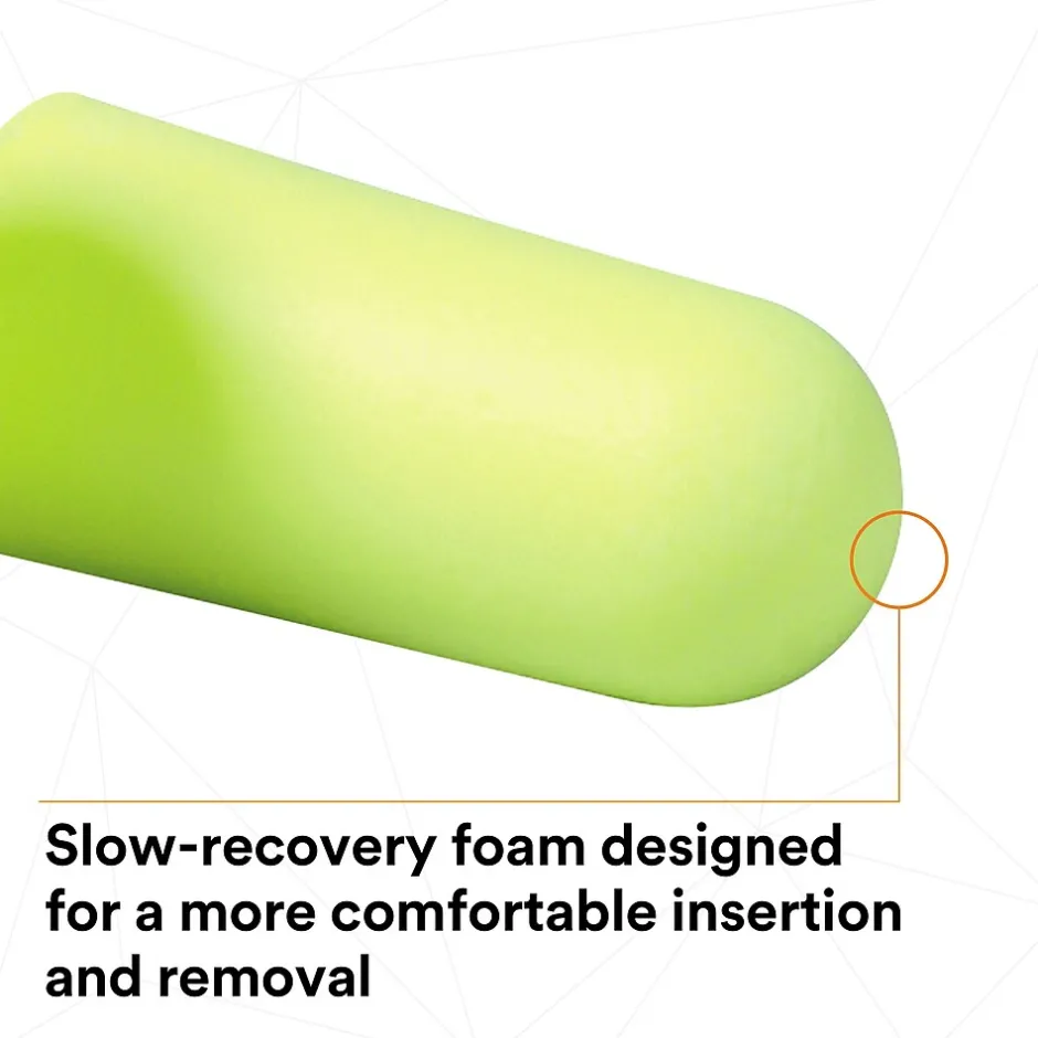 The 3M E-A-Rsoft Yellow Neons Uncorded Ear Plugs seal the ear canal with soft, slow-recovery foam for excellent noise reduction and reliable hearing protection. The tapered ear plugs are easy to roll down and insert, then expand within the ear canal for a comfortable, secure fit. Recommended applications include assembly and mechanical, chipping, chiseling, cleaning, drilling, furnace operations, grinding, heavy equipment operations, machining, metal repair, painting, pouring/casting, power fastening, riveting, sanding, sawing and welding. These ear plugs are commonly used in the following industries: agriculture, automotive, chemicals, construction, general manufacturing, healthcare, oil and gas, and pharmaceuticals. These ear plugs have a Noise Reduction Rating (NRR) of 33 dB. Ear plugs are made of a polyurethane. Test compatible with 3M E-A-Rfit Validation System.