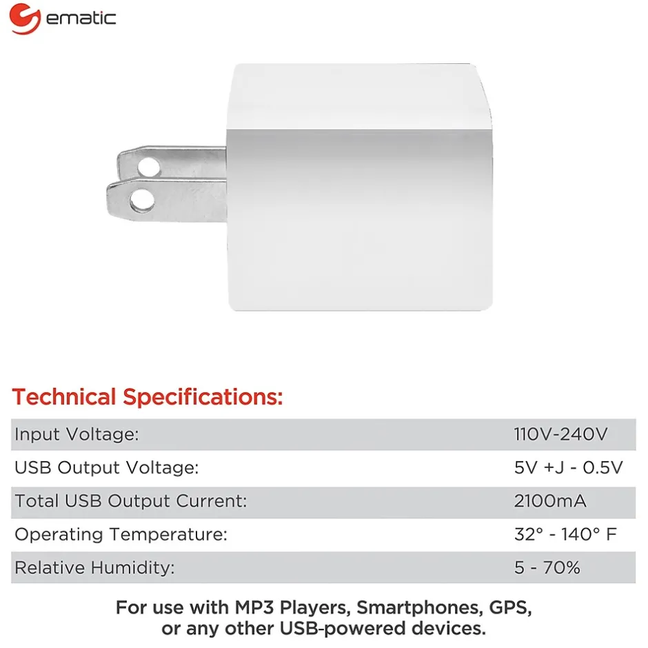 Charge 2 devices at once with the White Ematic 2.1 Amp 2-Port USB-A Wall Charger. This charger features 2 separate USB ports, 1 with 2.1 amps and the other with 1.0 amps. Simply plug your USB cables into the adapter and plug the adapter into the wall. Now you can charge your smartphones, tablets, MP3 players, laptops, and more with ease. The wall charger also protects against overcharging, overcurrents, and overheating, so you can rest assured when you charge your devices.