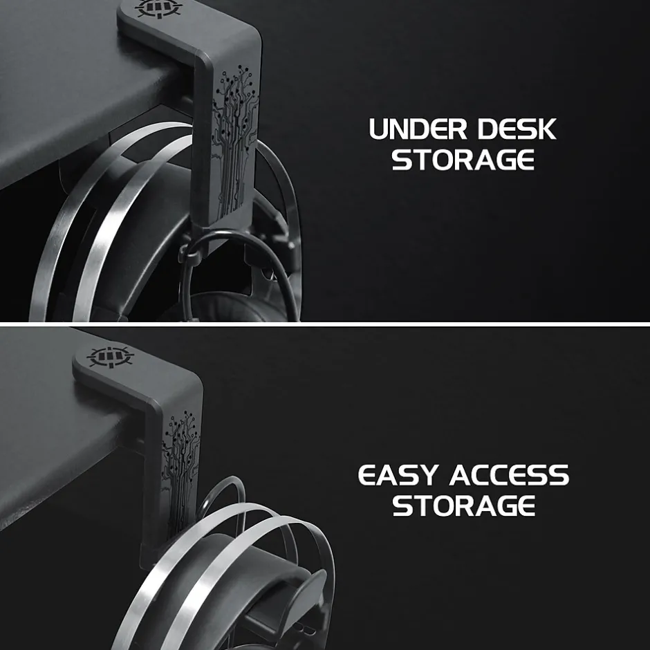 - 360 DEGREE ROTATING STORAGE: Swing the headphone hanger underneath your desk for convenient storage when not in use and easily swing it back around when you need that sweet sweet audio!