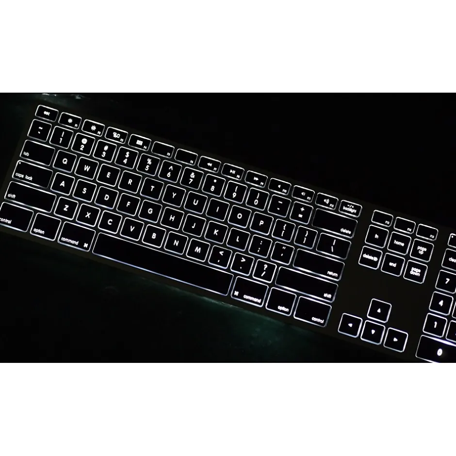 The Matias Backlit Wireless Aluminum Keyboard is a slim, aluminum, wireless keyboard with a similar layout to the familiar Apple Wireless Keyboard. It has four features that enhance your experience compared to the regular Apple Wireless Keyboard including: a numeric keypad, a rechargeable battery with a typical battery life of up to 1 year before needing recharging, can pair to up to 4 devices at the same time, and easily switch between the 4 devices with the press of a button, and it is backlit! You can control the brightness level, and turn it on or off.